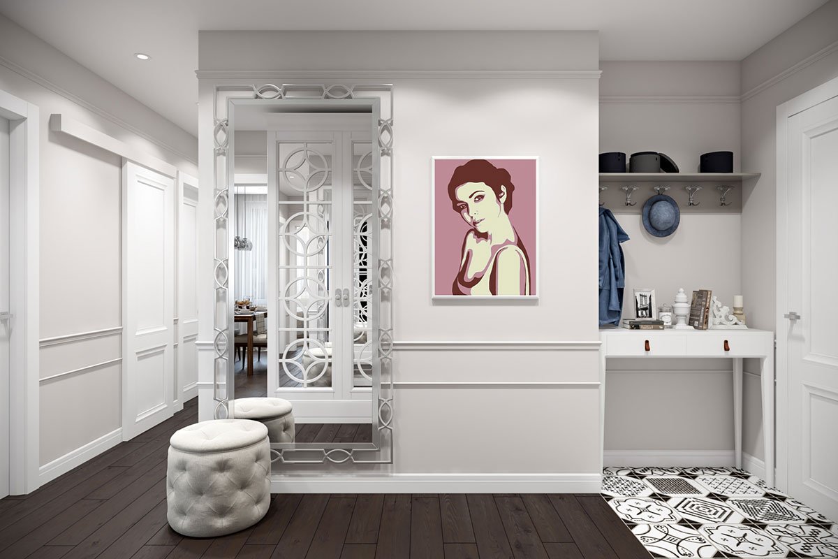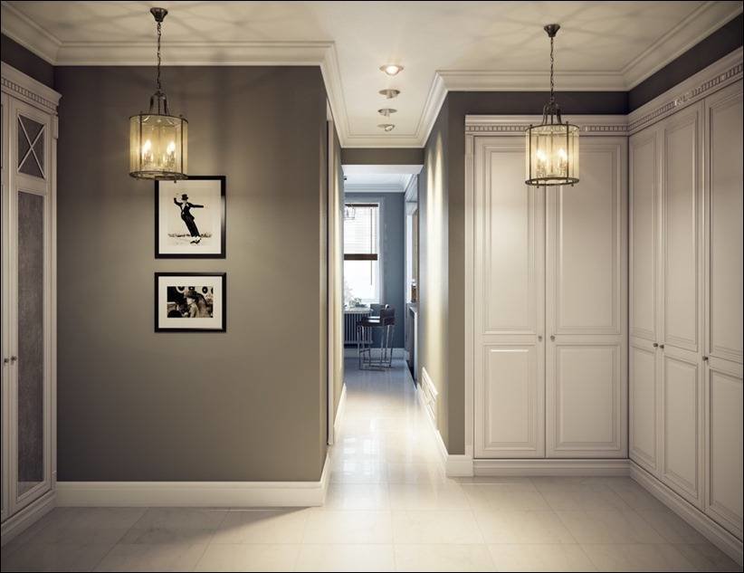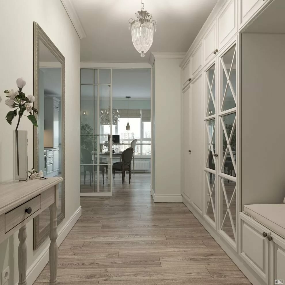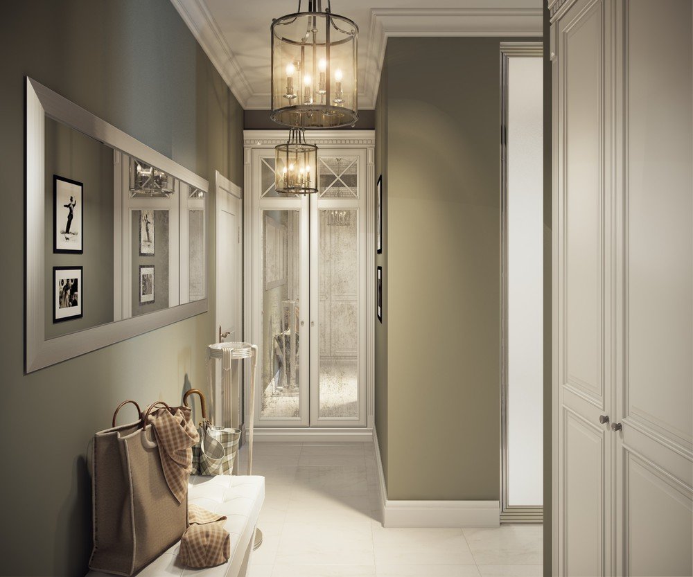 Un gran espacio libre, una paleta brillante, una falta de decoración casi completa es una excelente solución para el pasillo. Las características del estilo americano le permiten obtener una habitación espaciosa, desordenada y oscura, lo que elevará el estado de ánimo de los residentes en cada regreso a casa.