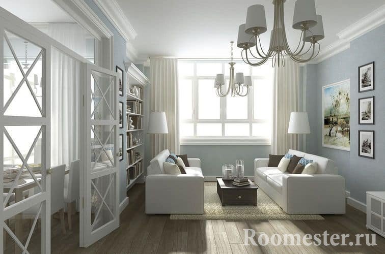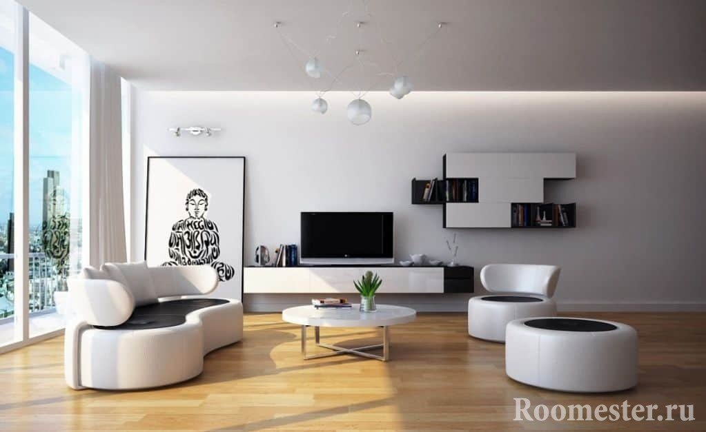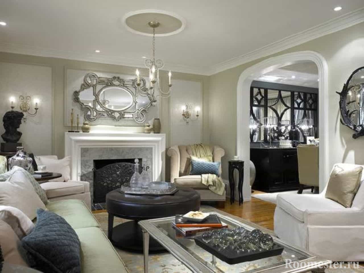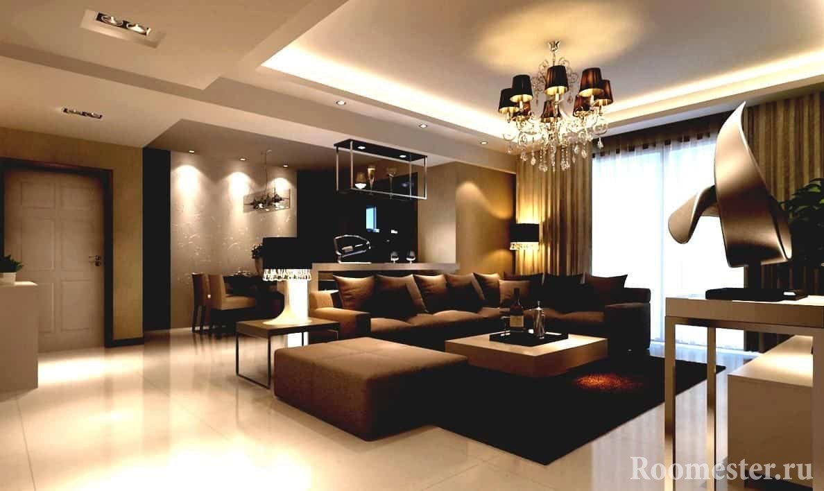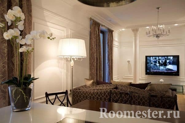 Para aumentar visualmente el espacio y saturar un diseño moderno moderado con elementos decorativos, vale la pena cuidar el diseño adecuado del techo. Los clásicos modernos sugieren la presencia de molduras de estuco o molduras en el diseño general del techo, lo que lo hace más refinado e inspirador. Los clásicos se verán especialmente bien si proporciona arcos altos en la sala de estar. Además, no es necesaria una amplia expansión del espacio, la habitación en sí puede ser pequeña;