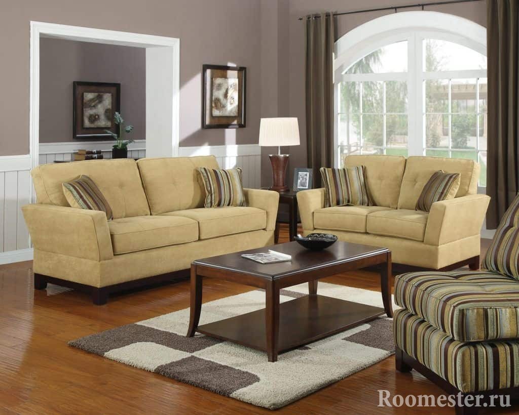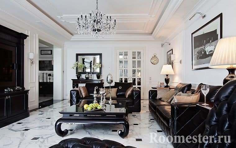 - Como ya hemos dicho, la interpretación moderna de los clásicos favorece el uso de materiales que imitan los naturales. Es decir, si es posible reemplazar los componentes naturales del interior con una opción más económica, sin pérdida de apariencia grave, entonces el propietario ni siquiera duda. No solo los materiales caros pueden proporcionar la decoración necesaria para la sala de estar. Este es uno de los principales matices a los que debe prestar atención cuando se encuentre en este interior;