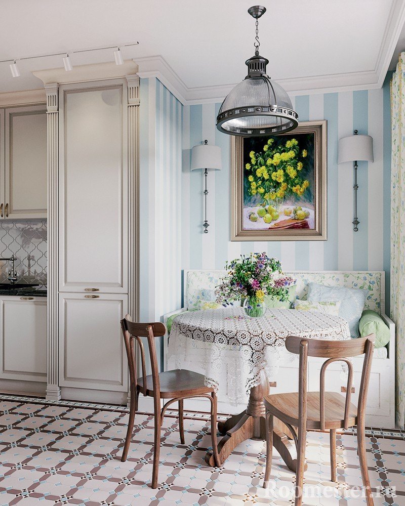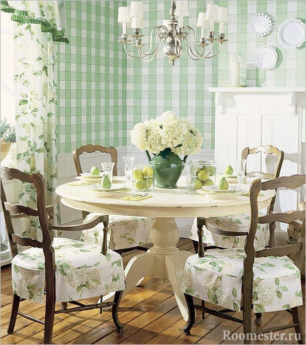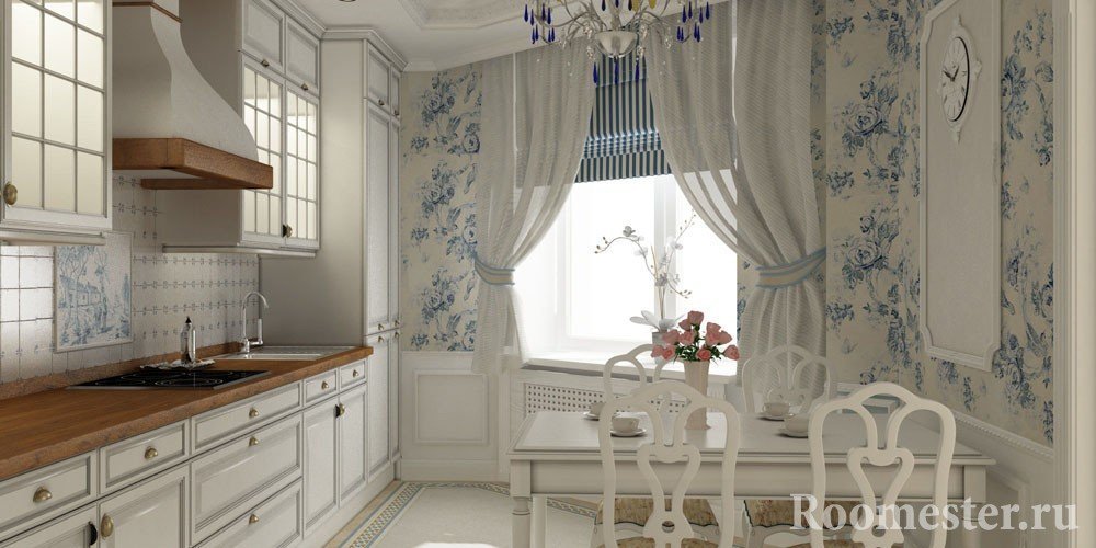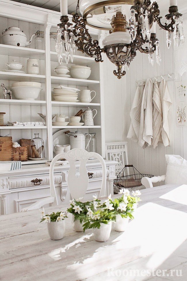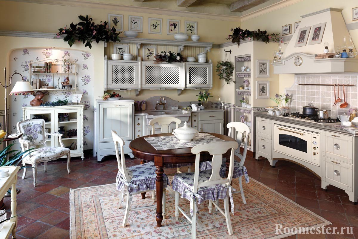 - La cocina en esta dirección se realiza con baldosas cerámicas con dibujos en la decoración. La habitación debe estar bien iluminada para que cada detalle se llene de sol. Los muebles se necesitan en madera clara, usados en algunos lugares, dentados, con el efecto del arte. Se le da un lugar especial a la estufa, está decorada de manera adecuada. No esconden los platos, sino que los colocan en estantes abiertos, agregando elementos de la antigüedad, por ejemplo, platos o figuras de porcelana, frascos transparentes con especias y aceite, artículos antiguos para el hogar. Placas pintadas en francés, bodegones románticos, son apropiadas en las paredes, panel decorativo. Los accesorios se eligen sin brillo, cerca del anterior.