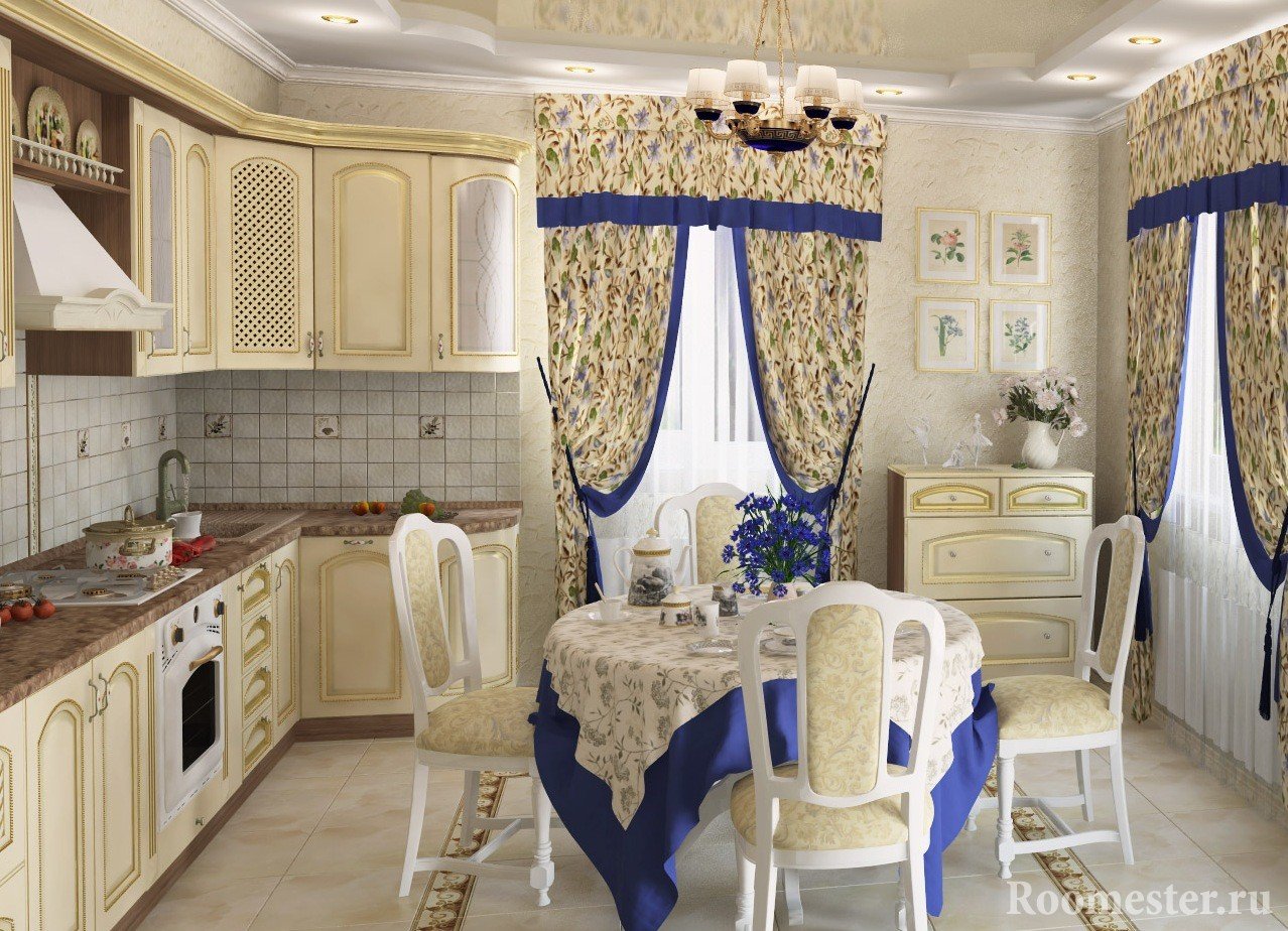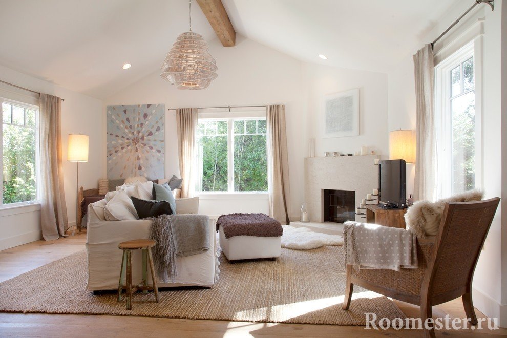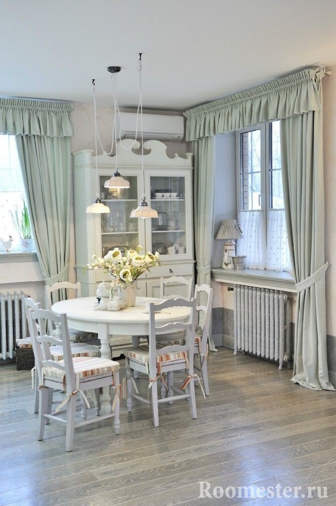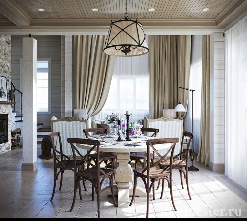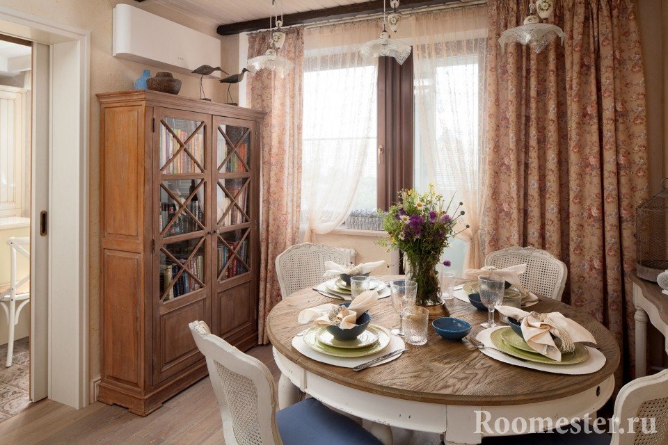 Las cortinas se eligen largas, de tela tradicional, lisas o decoradas con motivos. Bordados y cintas hechos a mano se ven muy bien en ellos.Aleros para cortinas: forjados o de madera, tan simples y ligeros como sea posible. Los fanáticos del bordado y el ganchillo tienen una gran opción para hacer sus propias envolturas en una silla, servilletas para un jarrón, una alfombra casera divertida.
