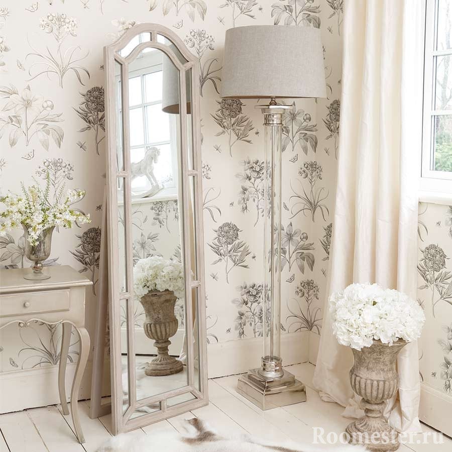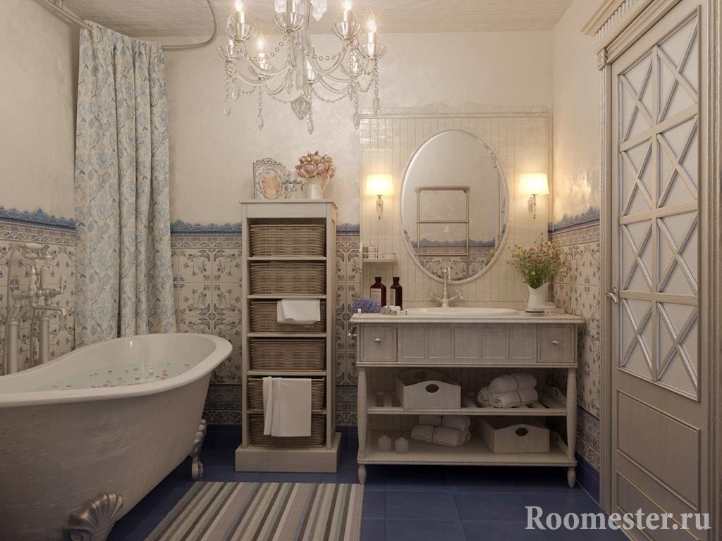 En las inmediaciones puede organizar un par de libros con encuadernaciones antiguas. Para habitaciones pequeñas, no se olvide de los espejos que expanden visualmente el espacio, enmarcados por baguettes elegantes. En las paredes puede colgar fotografías antiguas en un marco dorado, un reloj con motivos florales, platos de porcelana azul y, por supuesto, tapices bordados con escenas pastorales.