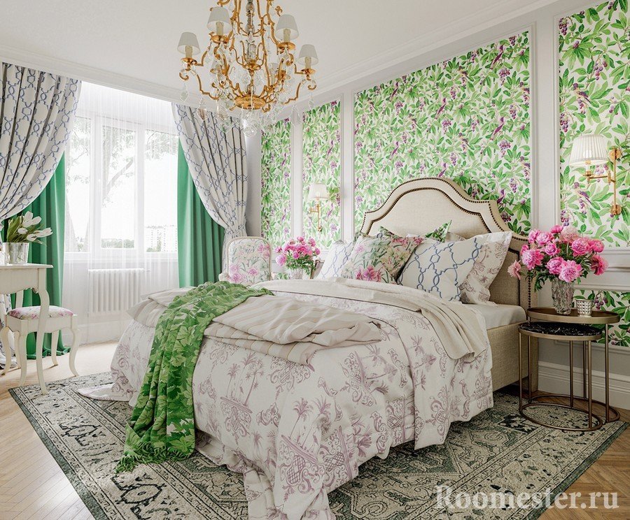 El ambiente francés debe leerse sin decir una palabra. Se enfatizan sus tejidos naturales de chintz, lino, algodón. La abundancia de flores, los patrones retorcidos en los materiales, se asemejan a un jardín realmente maravilloso, accidentalmente movido a la habitación. En todas partes hay motivos florales, volantes de encaje y volantes: en la colcha, almohadas, servilletas, manteles.