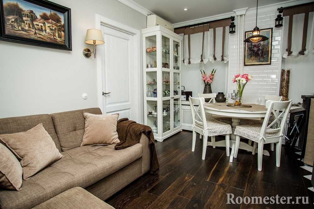 Para que el diseño de un apartamento de una habitación se elija de manera óptima y armoniosa, se debe prestar especial atención al mobiliario de las habitaciones. En cada caso, uno debe sentir un amor por la antigüedad, el romanticismo y una cierta ingenuidad. Los modelos de madera o mimbre con el efecto de pintura descascarada, textura rugosa, astillas artísticas encajarán perfectamente en el dormitorio rústico, la cocina o la sala de estar.