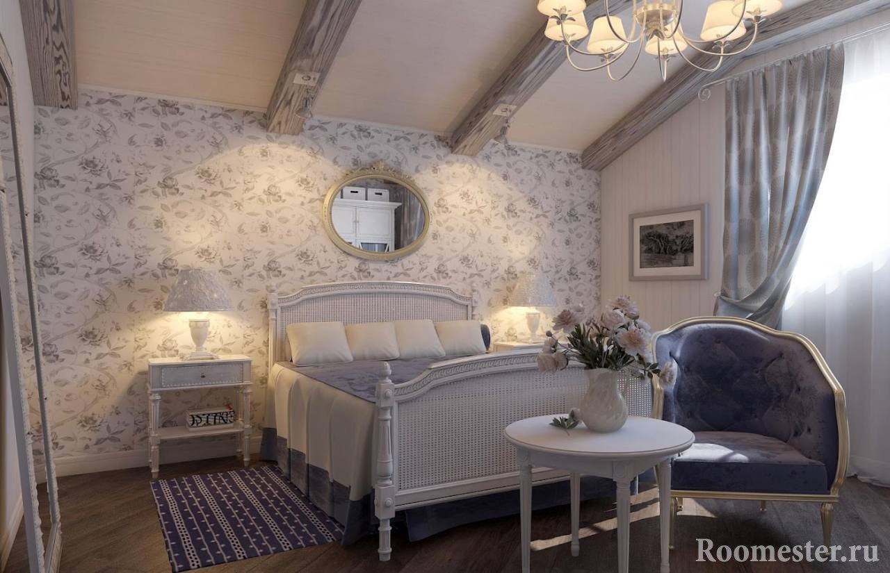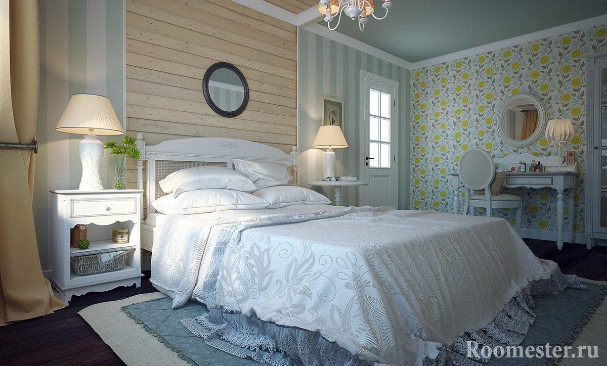 - Caracteristicas diseño de dormitorio Estilo provenzal: crea un ambiente tranquilo y pacífico para descansar y dormir, usando formas claras, tonos tranquilos de blanco, crema, oliva, dorado y lavanda. La cama ocupa un lugar importante: no debe ser demasiado grande, con cabecero macizo. Es mejor elegir opciones falsificadas. Cerca puedes poner una cómoda vieja, una silla compacta, una silla de mimbre, una otomana blanca. En la decoración de paredes y techos, es necesario lograr similitudes con los antiguos castillos y casas francesas. Los techos tensados modernos no podrán transmitir el espíritu de la provincia, su uso es inapropiado. Los materiales naturales como madera, piedra, cerámica parcial, telas de lino son bienvenidos. El papel tapiz de papel con un patrón de tamaño mediano que hace eco de los dibujos en la colcha o la alfombra enfatiza perfectamente la decoración rústica.