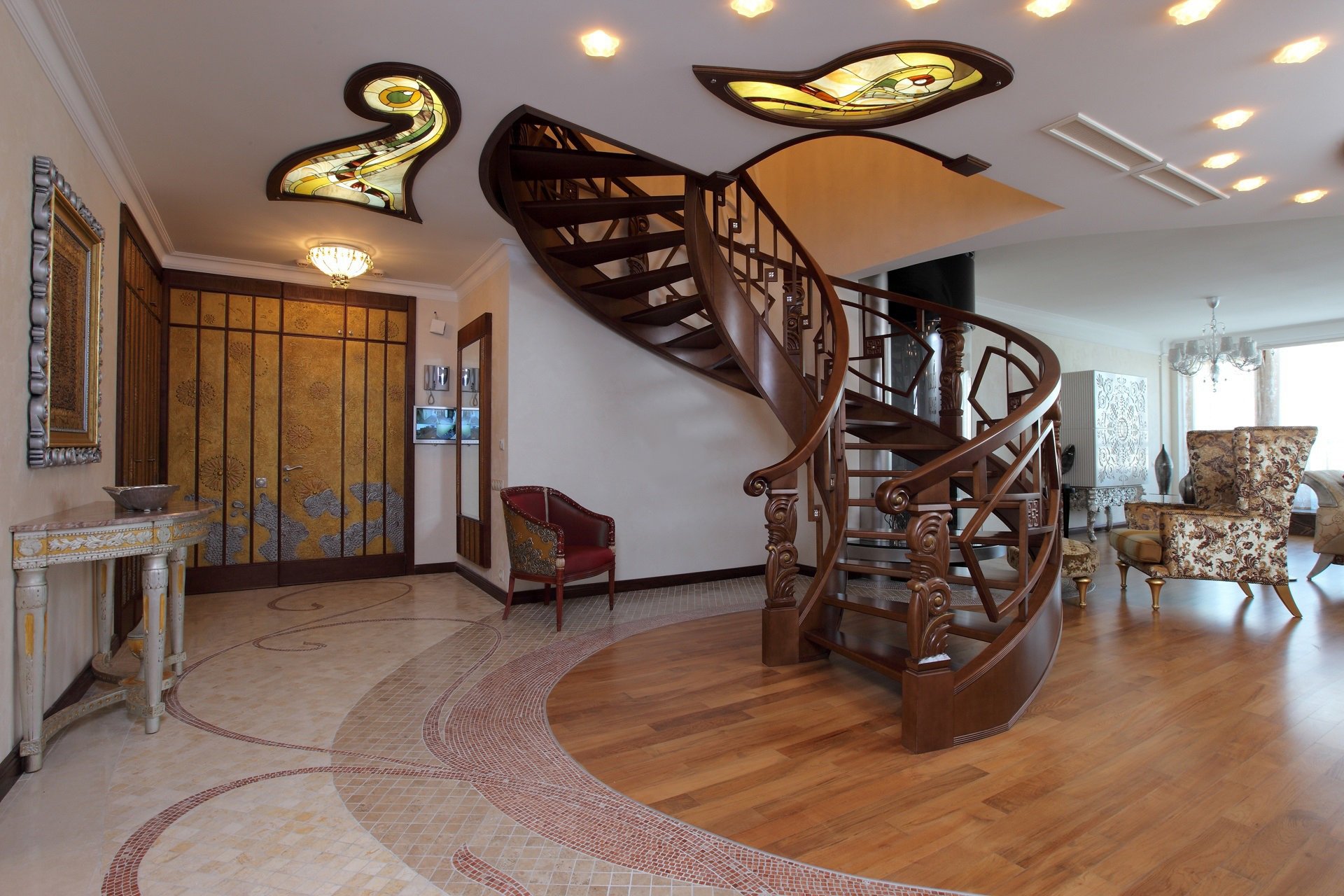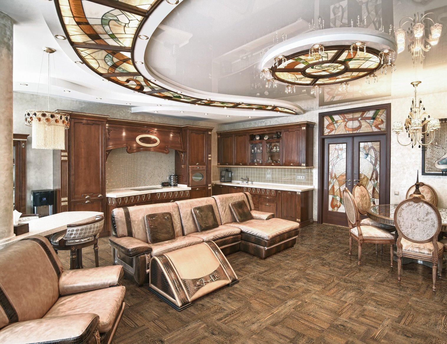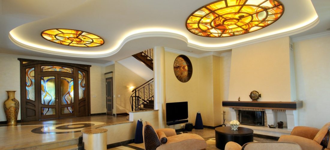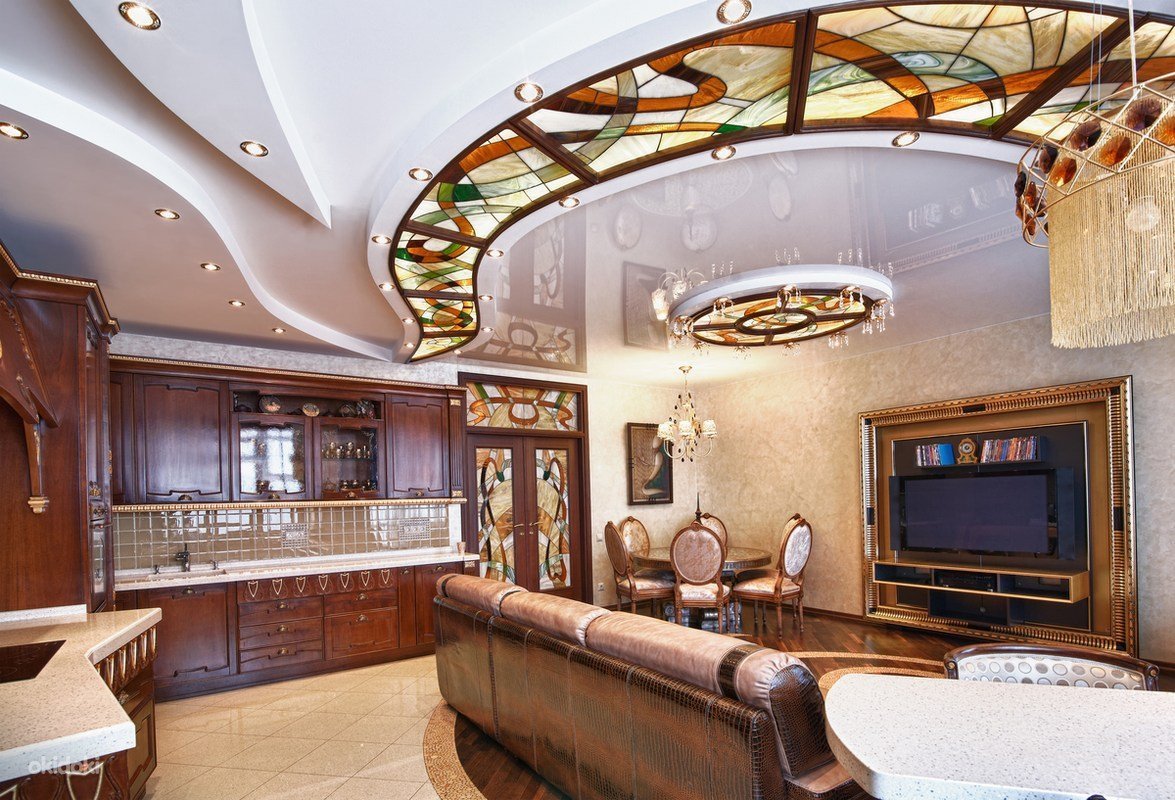 También hay exquisitas vidrieras en el techo, en combinación con poca luz.Gracias al juego de gafas multicolores, se crea un ambiente de cámara. Esta es la mejor manera de crear una sala de estar original. Los propietarios también pueden participar en el proceso de creación de vidrieras de techo. Dado que el ambiente en la habitación depende directamente de la calidad de la luz.