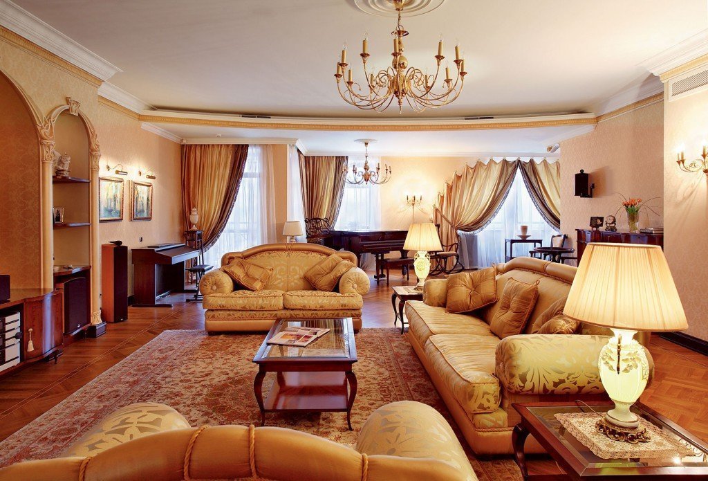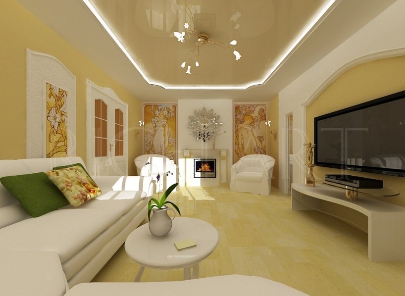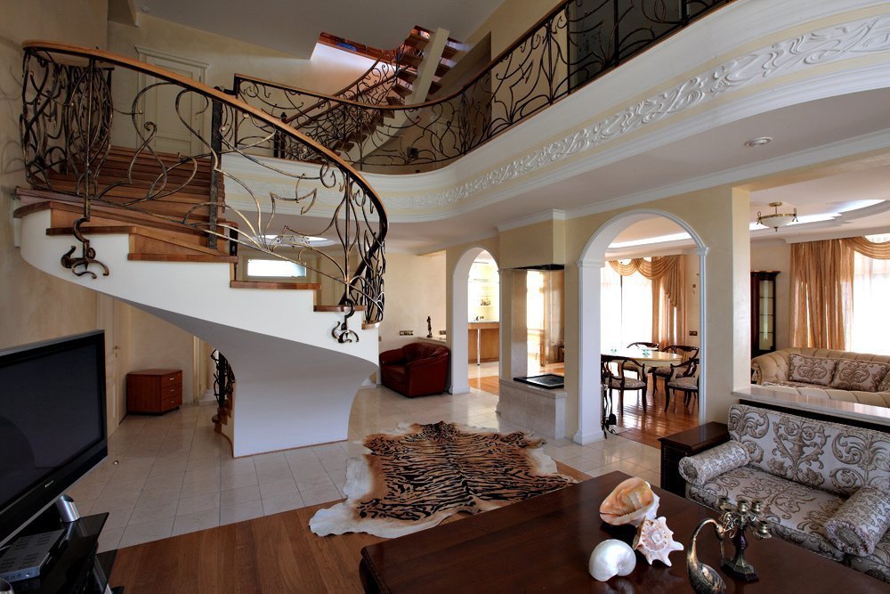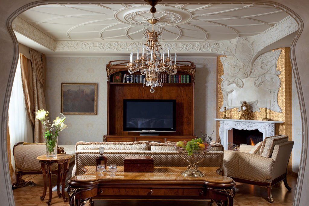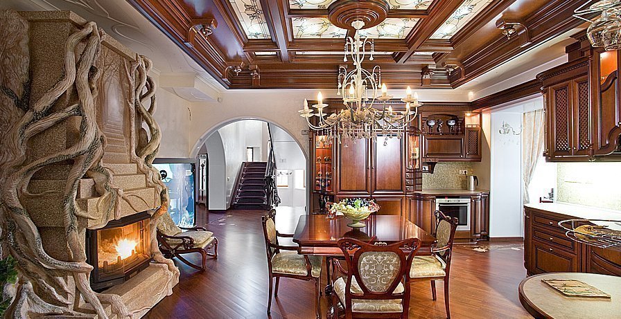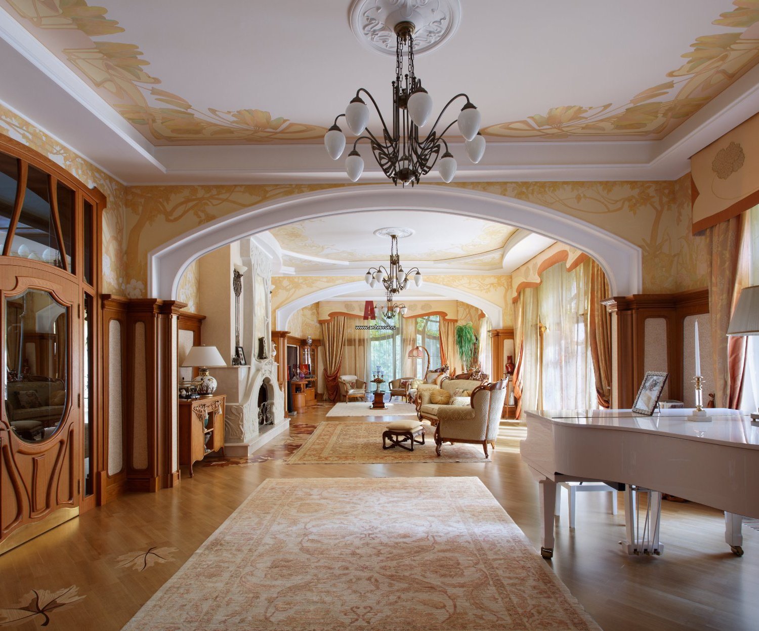 El techo está sujeto a requisitos especiales. Contrariamente a la práctica común, se presta más atención a la decoración que a las mismas paredes. A menudo hay un relieve de moldura de estuco, elementos volumétricos de madera natural. Uno puede ver la monumentalidad del clásico en esto: cuando la combinación de líneas onduladas y patrones de plantas con elementos estáticos en el techo forma la dinámica de la asimetría.