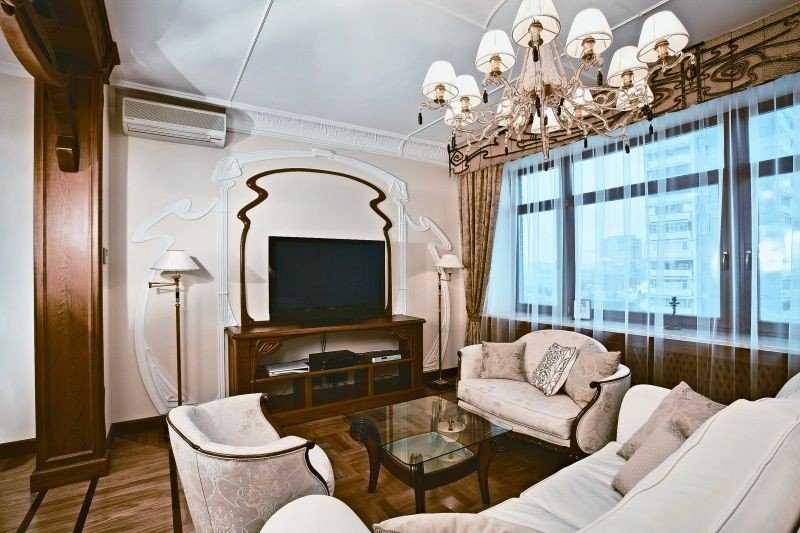 Una característica del Art Nouveau decorativo es que, con su ayuda, puede ocultar el mal diseño del apartamento con una disposición no estándar de las habitaciones. Un diseño interior asimétrico que gravita en texturas onduladas adornadas encaja fácilmente en él.