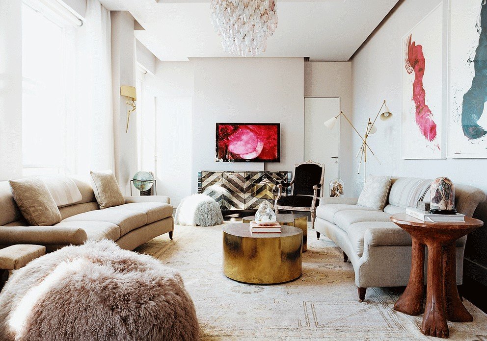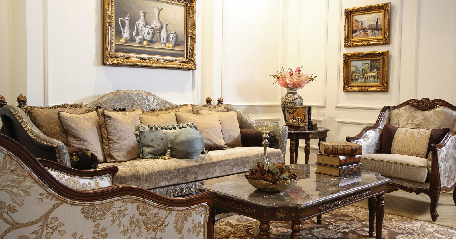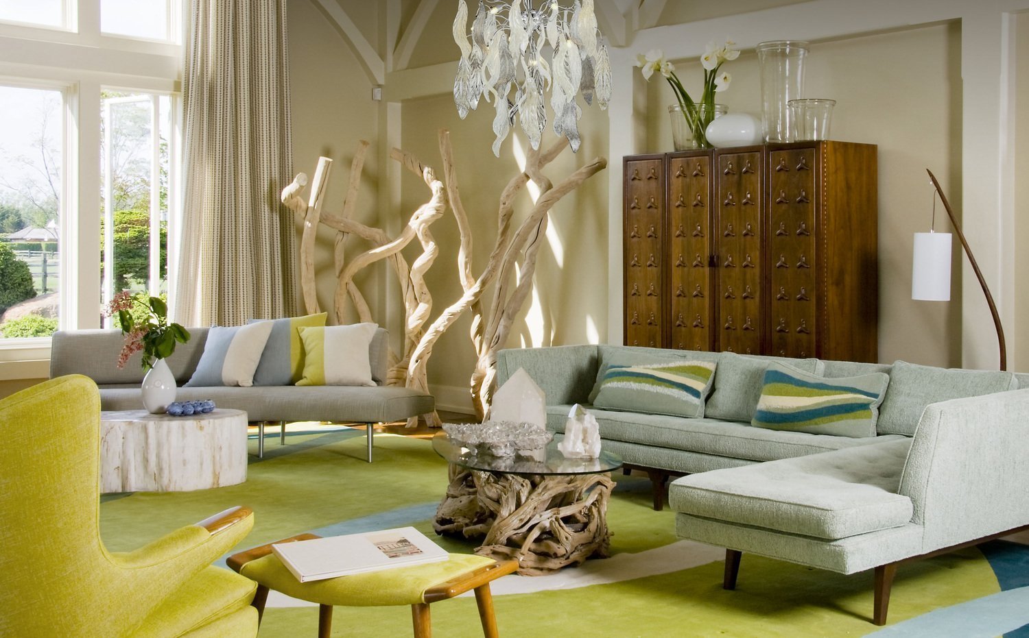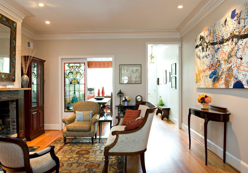 Los accesorios hechos de varillas de metal, madera o cristal juegan un papel importante en la sala de estar. Las elegantes pinturas art nouveau serán el acento perfecto.