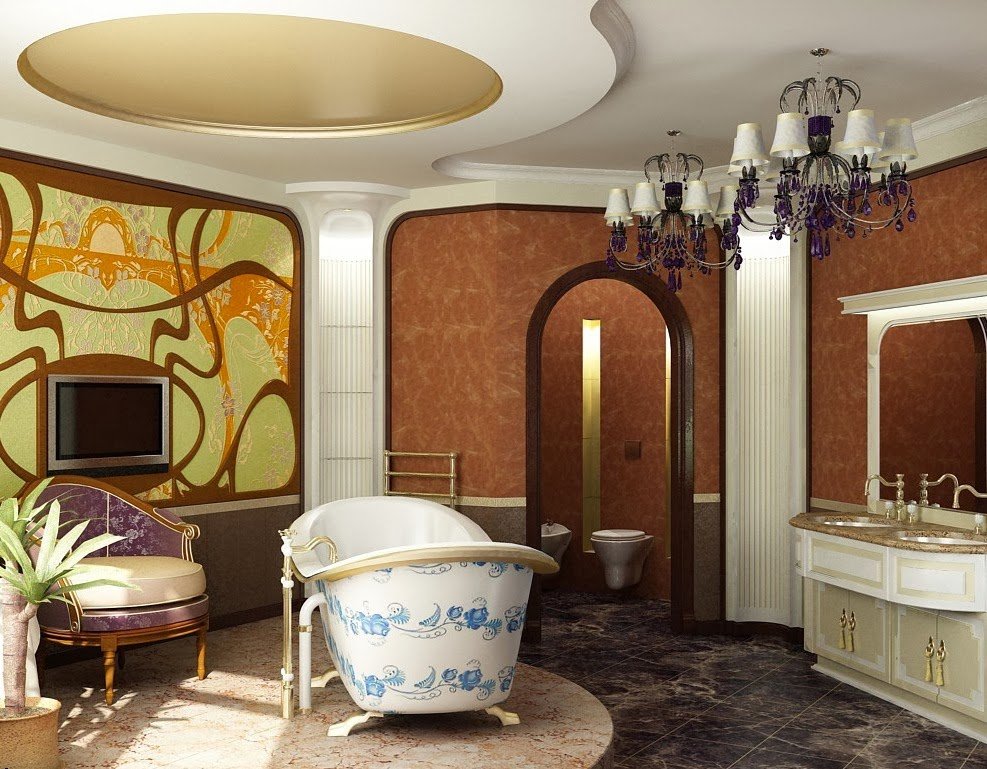 Pero los elementos de plomería le permiten encarnar la modernidad en todo su esplendor: los materiales forjados no estándar se seleccionan de acuerdo con el color del acabado y se ahogan en las paredes. Toalleros rizados con calefacción, bañeras futuristas decoran cualquier habitación. El énfasis en la asimetría se crea utilizando focos y espejos. Los accesorios de baño incluyen anteojos originales para cepillos de dientes, perchas, flores artificiales.