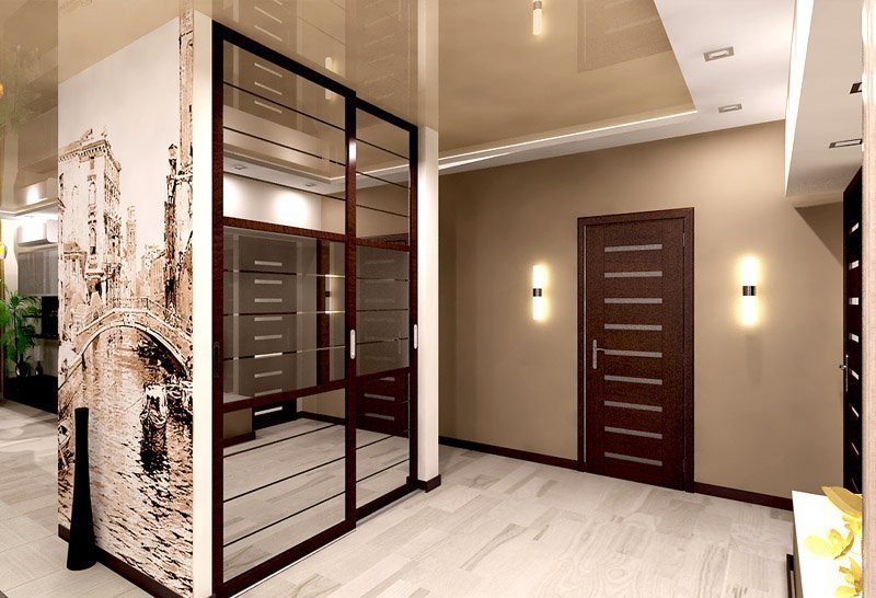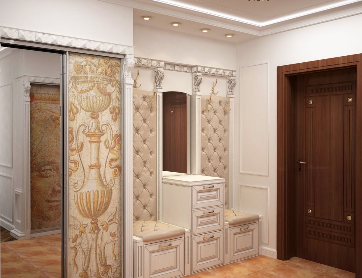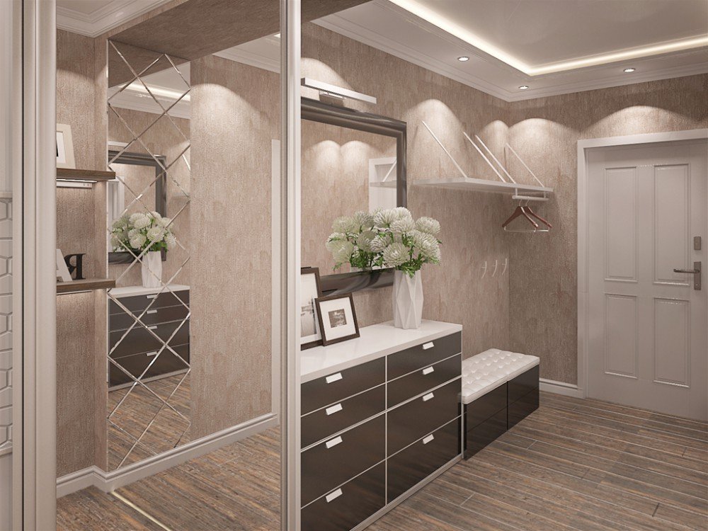 Los principales accesorios en el corredor son espejos decorativos y pinturas temáticas. Pero los elementos textiles deben ser evitados.