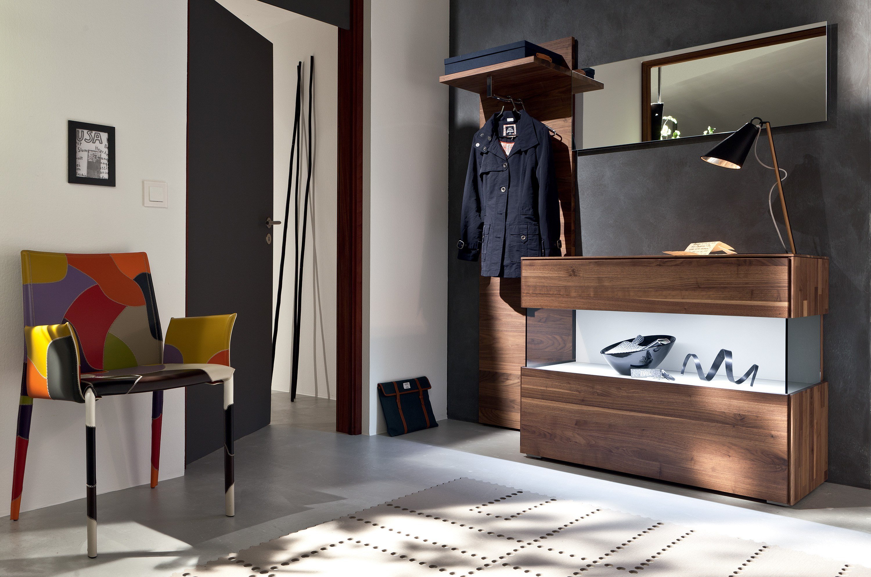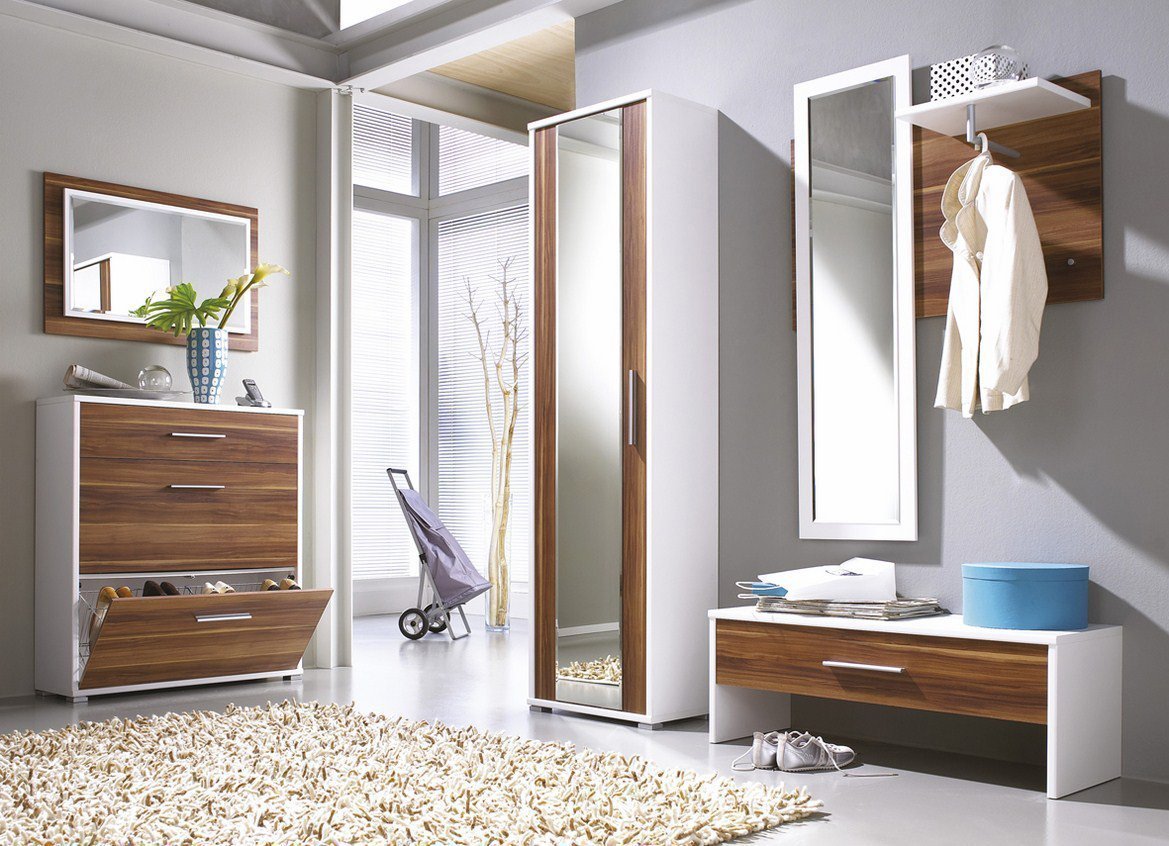 Los muebles del pasillo implican el uso de muebles empotrados en forma de armarios deslizantes. Los atributos obligatorios incluyen un cristal de muelle con formas asimétricas curvas. Se permite el color brillante de la madera natural. Para mayor comodidad, se instalan varias luces de pared a poca altura del piso.