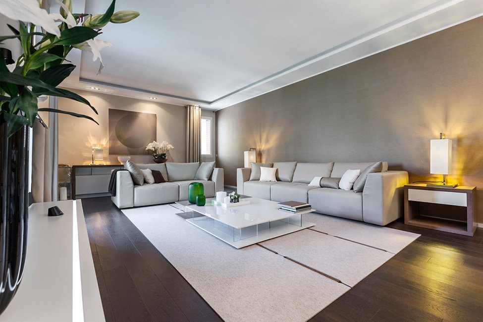 Para la recreación más completa del estilo en la sala de estar, necesitará una habitación espaciosa. Los planos están decorados con transiciones suaves, pintadas en tonos cenicientos de la paleta de colores seleccionada. Puede usar un degradado para enfatizar zonas. Para la decoración de paredes, no se recomienda recurrir al uso de papel tapiz o yeso. Es ese fondo de pantalla líquido con un patrón apenas perceptible. Para revestimientos de techo, la pintura es la mejor opción. Sin plástico ni forro texturizado. El valor es la iluminación difusa.