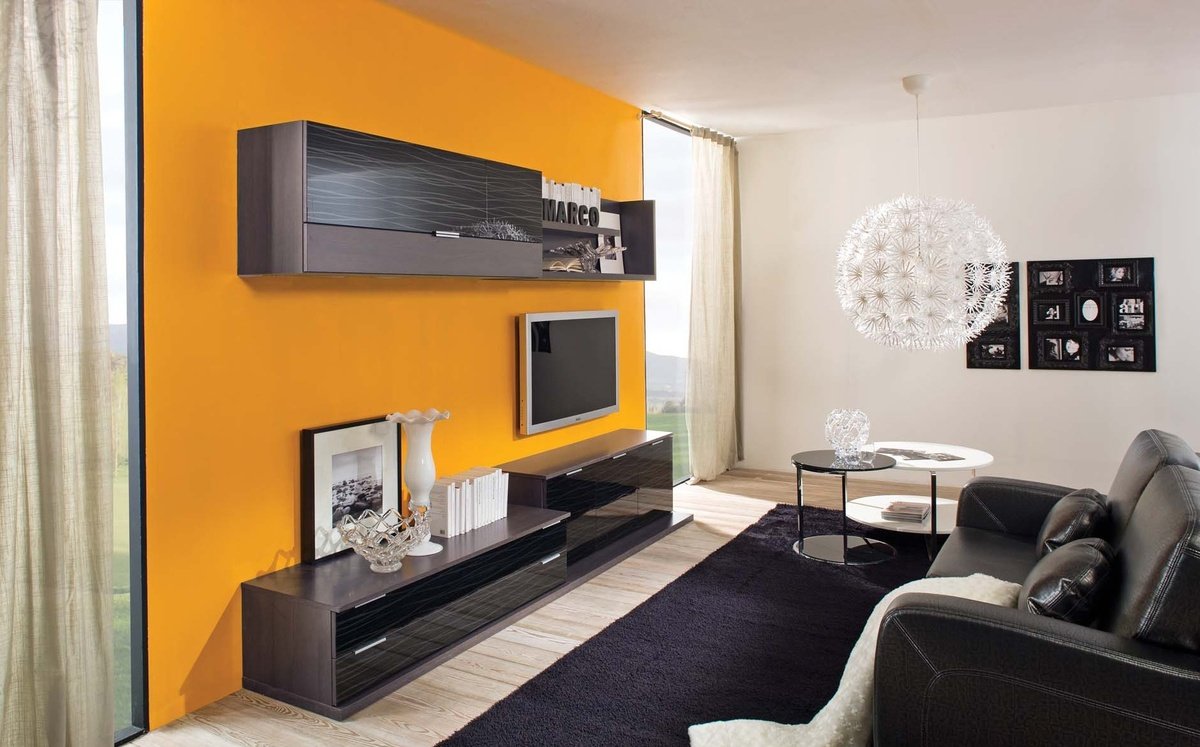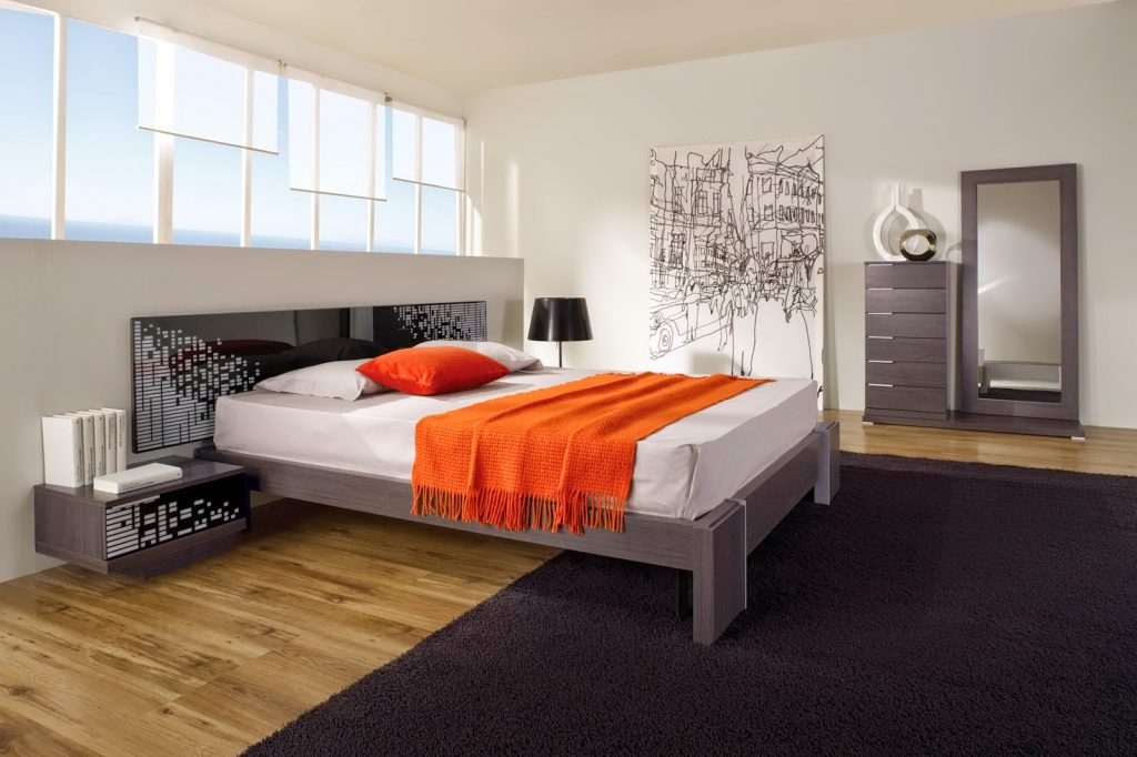 El piso resistente al desgaste en forma de parquet monofónico se puede complementar con alfombras decorativas de un color contrastante. Sin embargo, la alfombra no es categóricamente aplicable en el estilo moderno. Lo mismo puede decirse sobre el linóleo o las baldosas cerámicas.