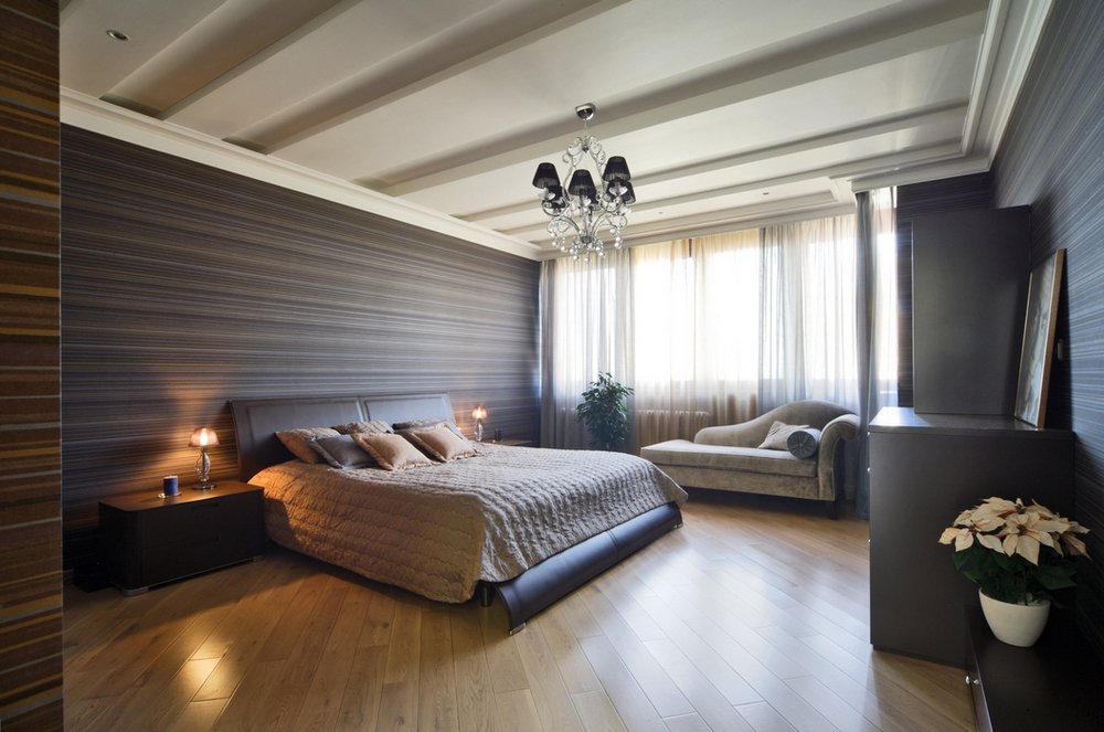Un rasgo característico de la habitación en este estilo es el minimalismo de los accesorios, una paleta de colores y una iluminación suave. Al decorar las paredes, se permite el enlucido con textura en las mejores tradiciones del clasicismo, empapelar sin dibujos vívidos. El techo es una continuación de las paredes, por lo que se enfrenta con los mismos materiales. Los revestimientos elásticos de moda se combinan con éxito con la luz difusa. Pero se deben evitar las molduras antiguas. Se instala un costoso parquet de madera valiosa como revestimiento del piso.