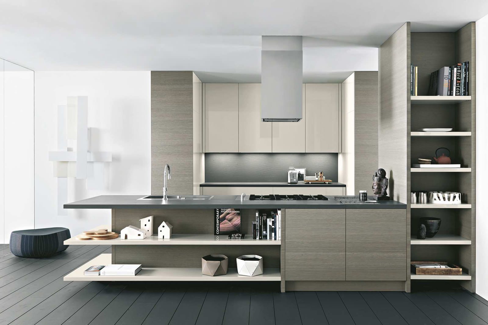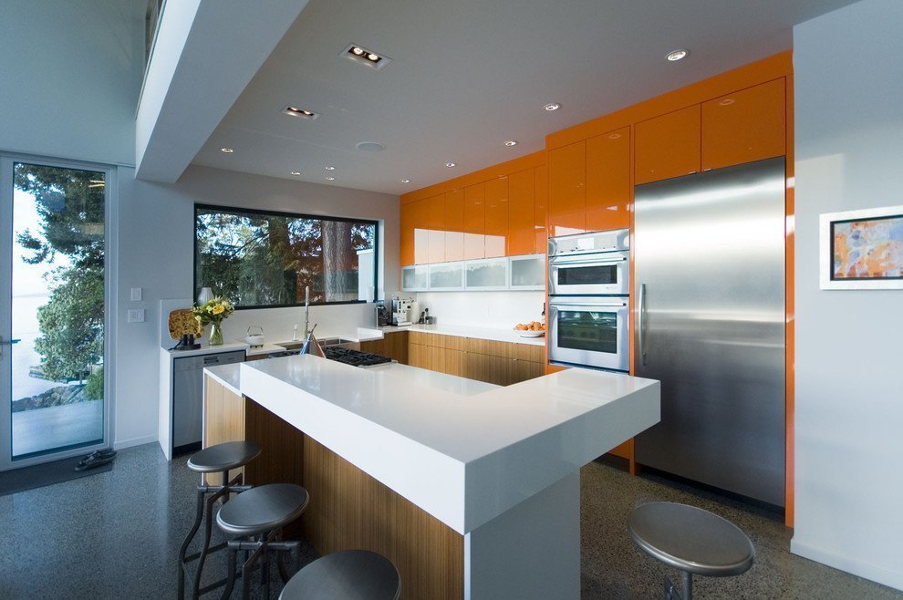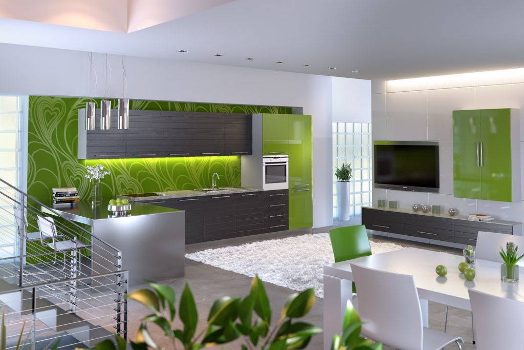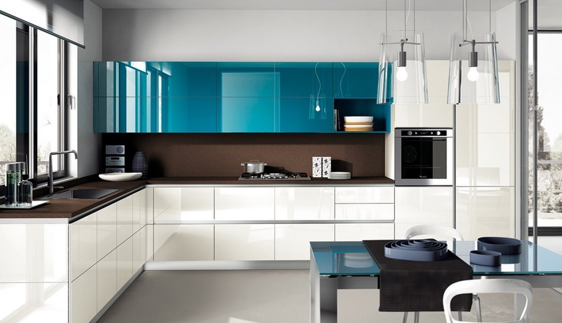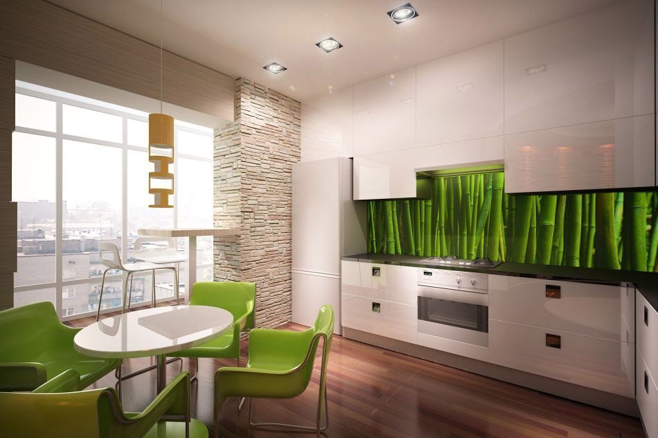 El estilo práctico y funcional se adapta fácilmente incluso en una cocina pequeña. La decoración simple de la pared solo sirve como fondo, por lo que se utiliza pintura. Los papeles pintados de vidrio se ven algo mejor que los azulejos de cerámica, ya que las formas rectangulares afiladas de este último violan la armonía del estilo. El revestimiento del techo se fusiona con las paredes mediante transiciones suaves. A veces se usa un techo tensado sin una textura expresiva. El piso también juega un papel pasivo, en armonía con el conjunto de muebles. La mejor opción son los pisos a granel. El granito de color sólido rara vez se usa en el color de los muebles. El laminado práctico está ganando popularidad: su gama le permite elegir el tono correcto, en contraste con el fondo de los planos.