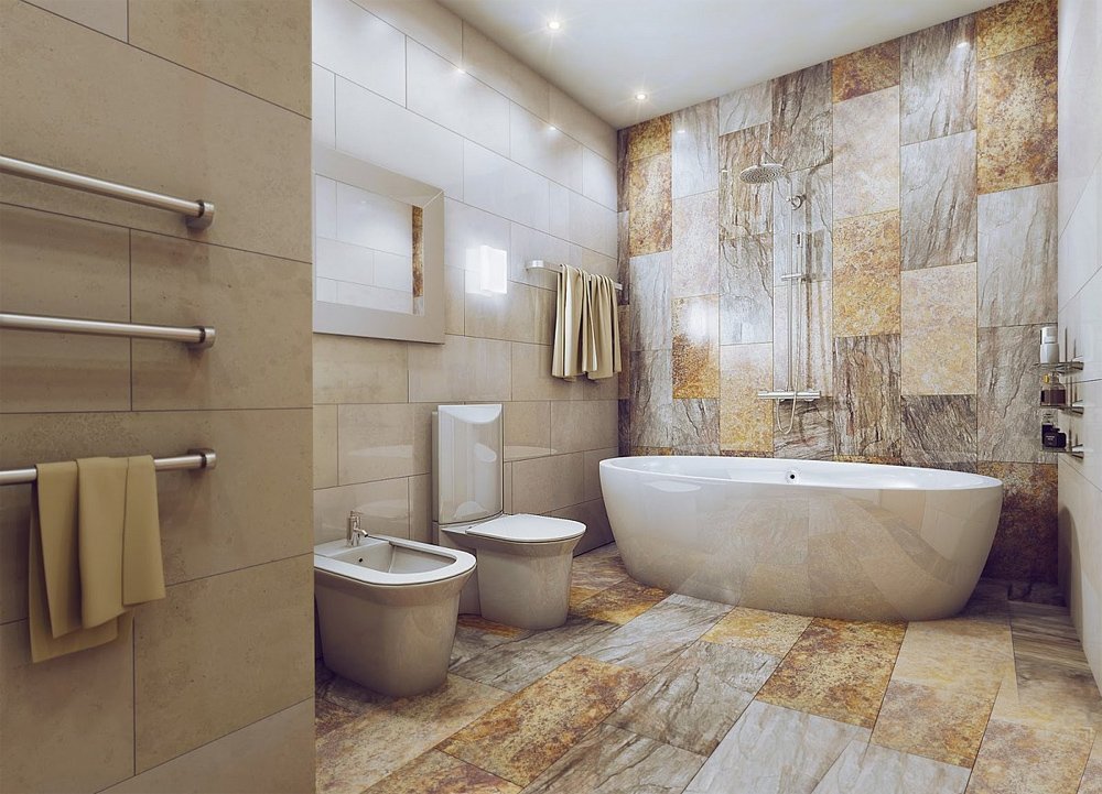 Se usan dos capas para enfrentar esta habitación: de fondo y decorativa. El primero implica una gradación de color, y el segundo, una textura inusual de la decoración. Baldosas cerámicas, manchas, mosaicos de colores: estas opciones son las más comunes. Los materiales cubren todos los planos.A menos que el piso pueda ser a granel. En este caso, su esquema de color se caracteriza por un gradiente: desde la parte más clara de las paredes hasta la más oscura.