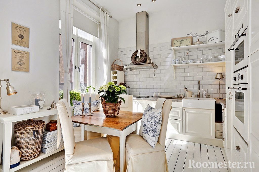 No te olvides de la decoración y los textiles. Cortinas de luz, muchas pinturas de naturaleza muerta, arreglos florales, servilletas, revitalizarán la cocina.Vale la pena complementar el interior real con detalles antiguos: una vieja regadera en mal estado, una tetera, platos antiguos, un cubo de flores, una maleta que se usa como estante. Todo esto creará una comodidad única, y usted, los miembros del hogar y los invitados no querrán salir de la cocina, ¡y beber té se convertirá en una ceremonia agradable!