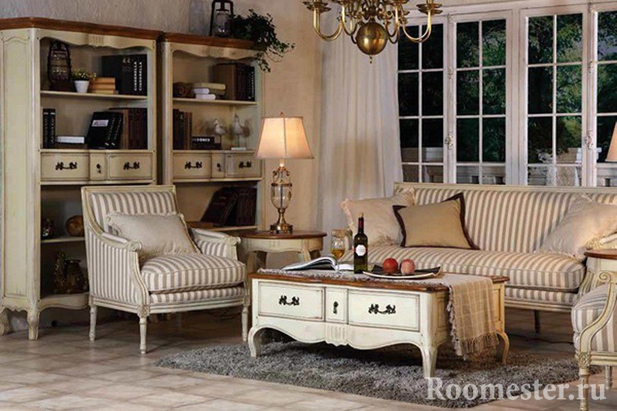 No hay muchos detalles. Candelabros dorados o candelabros, apliques con una vieja pantalla de lámpara, muchas pinturas en el estilo renacentista, flores en jarrones, libros, ataúdes, figuritas, muchas, muchas otras pequeñas cosas. ¡Que no sean funcionales, pero sin ellos, la sala de estar francesa simplemente no tendrá alma!