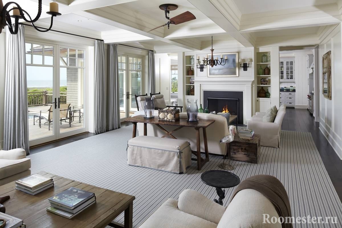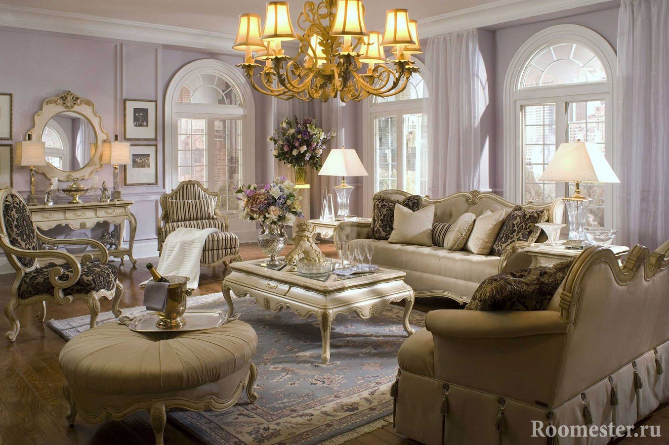 El centro de la sala es un elegante sofá o sofá. Necesariamente: una enorme estantería abierta o muchas estanterías. Cerca del sofá necesitas una mesa de café de madera, con patas delgadas talladas, con una hermosa servilleta que se puede decorar con un ramo de flores, una figura y un teléfono raro. Sillones, lámparas de mesa, lámparas de pie largas: todo debe tener el mismo estilo lujoso. Bueno, ¡una chimenea será el complemento perfecto del conjunto!