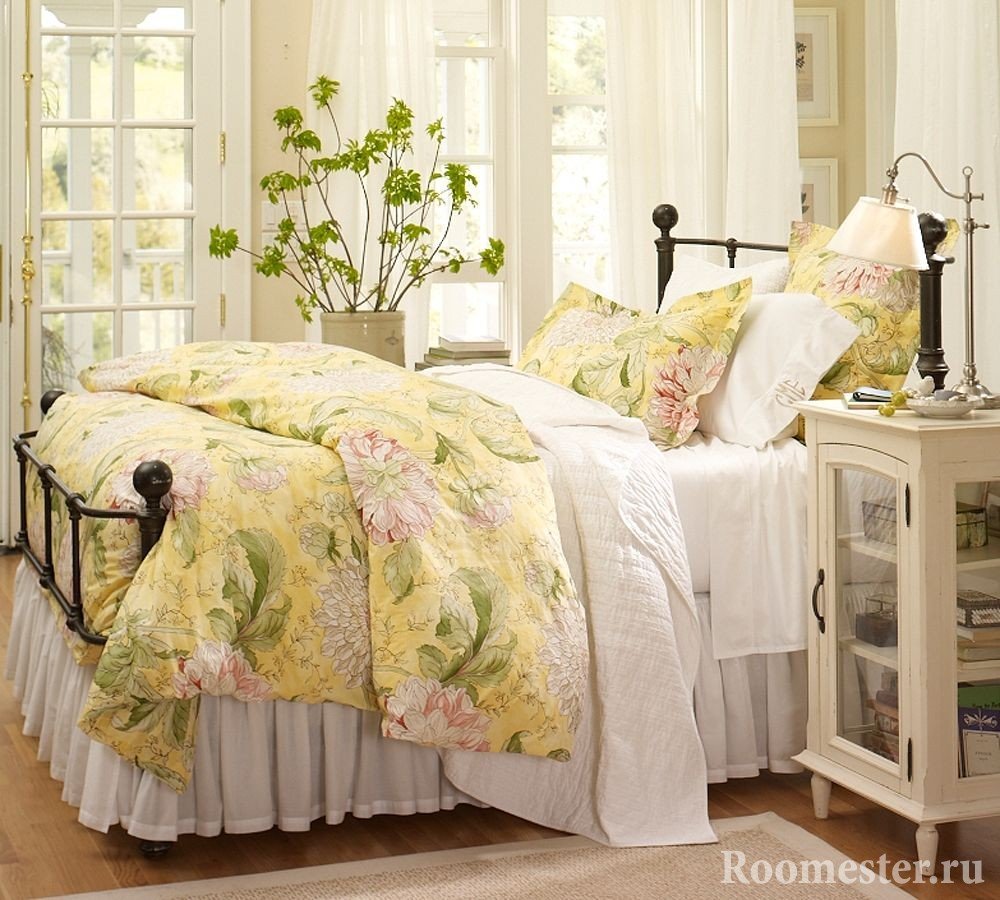 Esta es la habitación real en la que quieres pasar largas noches dulces. Lujoso, dulce, romántico: esta habitación se ve simplemente encantadora. El centro obligatorio de tal dormitorio es una cama grande con un respaldo alto de madera. Cuanto más grande es la cama, más exactamente se transmite el estilo francés. Necesariamente: un mar de camas de plumas, almohadas, una magnífica manta, varios volantes. El color de los textiles para dormir es dorado, rosa pálido o azul pálido, beige, pero no blanco. Asegúrese de acostarse frente a la cama con una alfombra suave y esponjosa, sobre la cual es muy agradable caminar con los pies descalzos.
