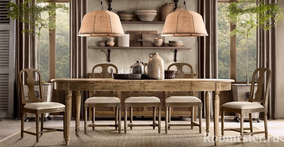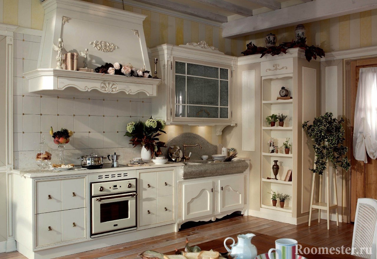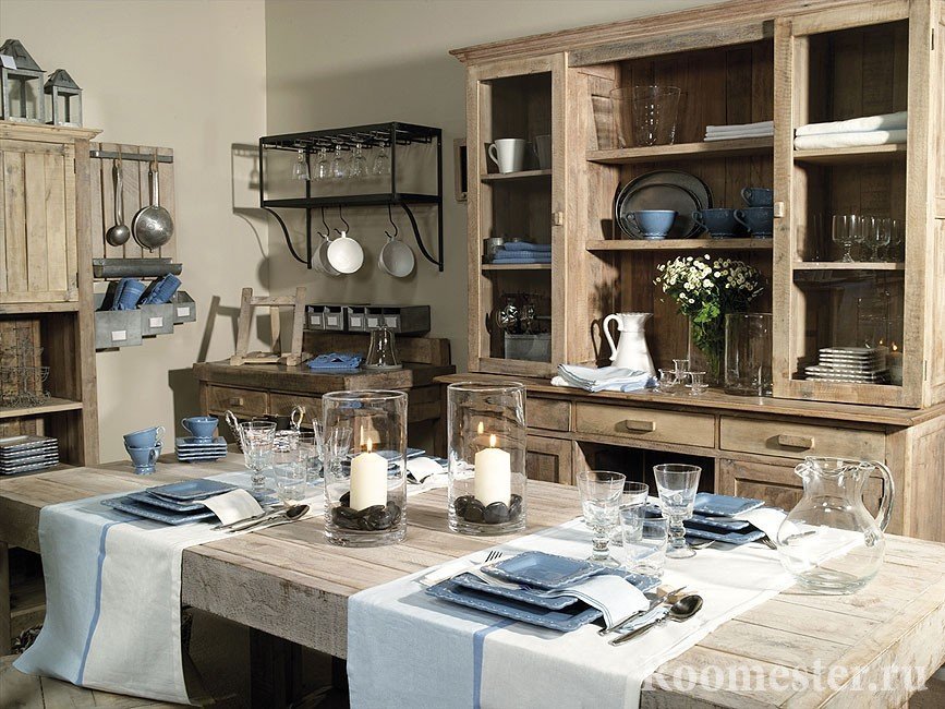 La base de la cocina son muebles, revestimientos de paredes y, lo más importante, una mesa de comedor. Todo debe ser real: si el azulejo, entonces lujoso, en colores naturales. En el piso - cerámica o parquet de madera. Puede decorar las paredes con paneles de madera adicionales, esto le dará un encanto y entusiasmo especiales. El juego de cocina puede ser de un color de madera natural y puede pintarse en un tono delicado: lila, gris azulado, beige o durazno. Debe haber muchos armarios, cajones y estantes, no solo por su funcionalidad y conveniencia, sino también para acomodar más decoración. Los estantes para platos pueden estar abiertos; los platos y vasos hermosos deben estar visibles.