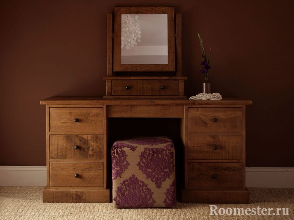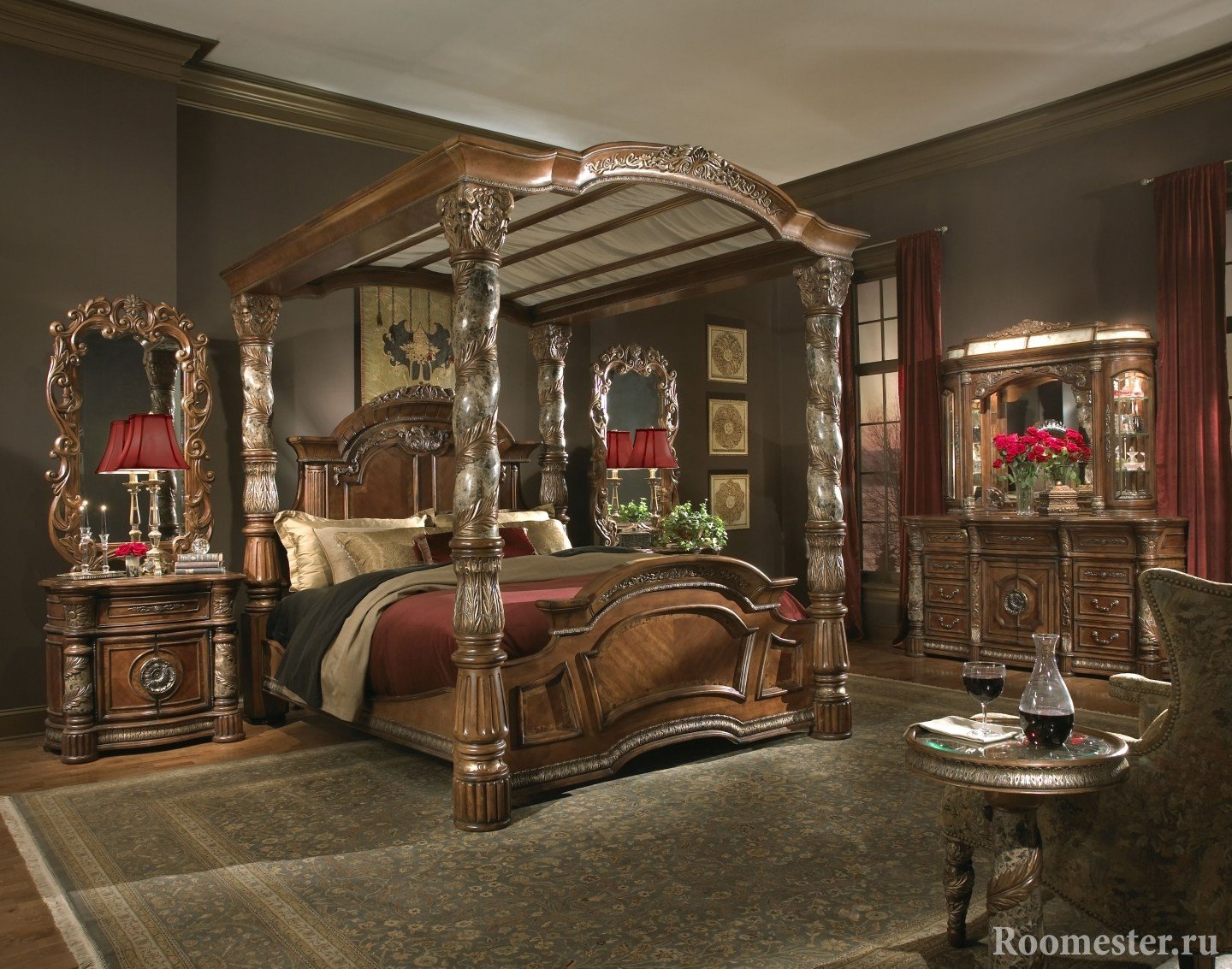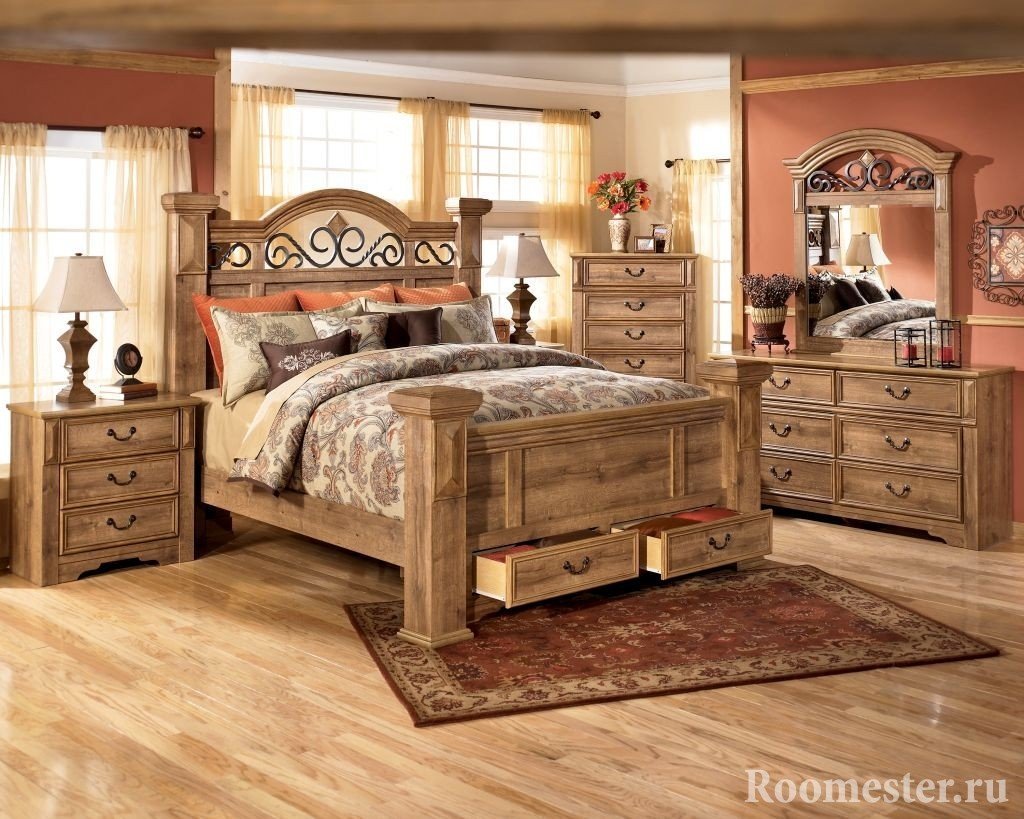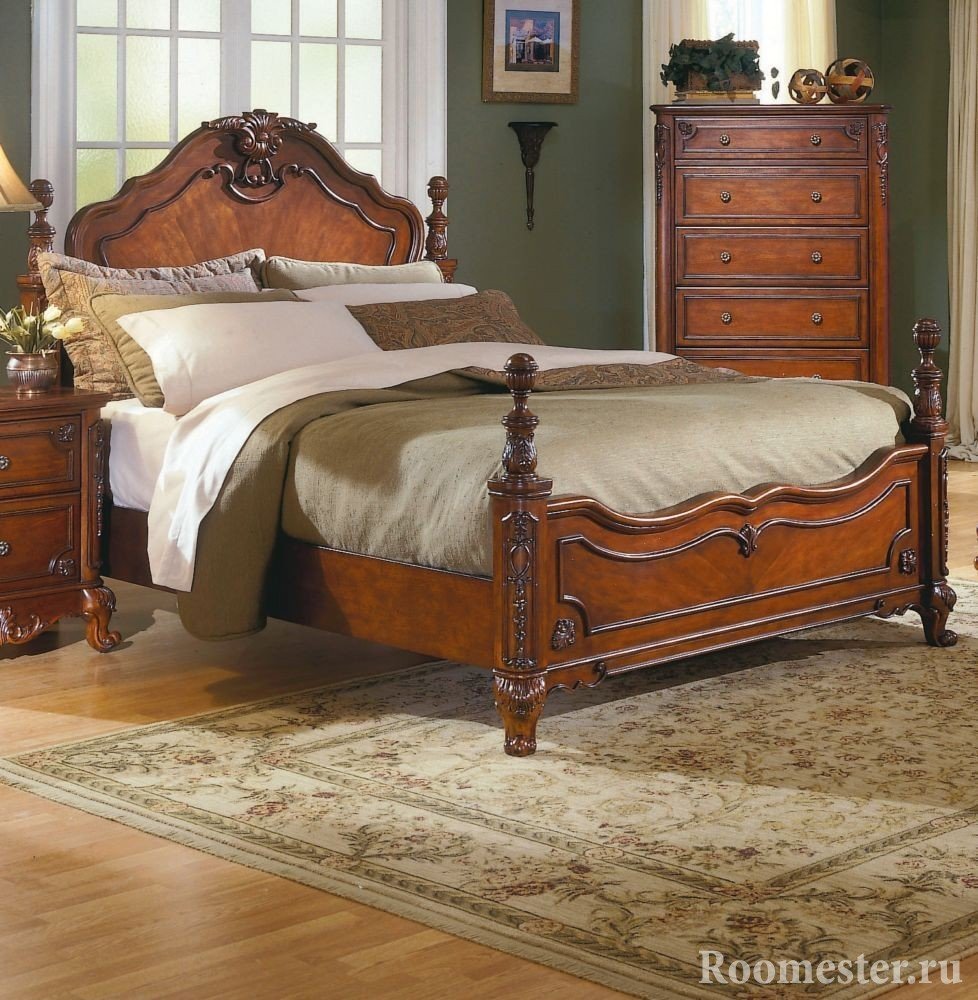 Un armario grande y espacioso o una cómoda con cajones decorará la habitación "parisina", le dará practicidad y también agregará belleza. Todos los muebles de madera (cómoda, mesitas de noche o mesitas de noche, cama) deben ser del mismo tipo de madera, en un esquema de color. La madera se puede usar ligeramente de manera natural o artificial, y a veces incluso la pintura desgastada se ve muy elegante. Mesitas de noche, una mesa de café o un tocador: todo debe ser con elementos de madera retorcidos, macizo, muy duradero. Debería dar la impresión de que este mueble es durante siglos. A pesar de su gran durabilidad, los muebles deben ser elegantes: con patas delgadas curvadas, puertas elegantes, con tallas finas.