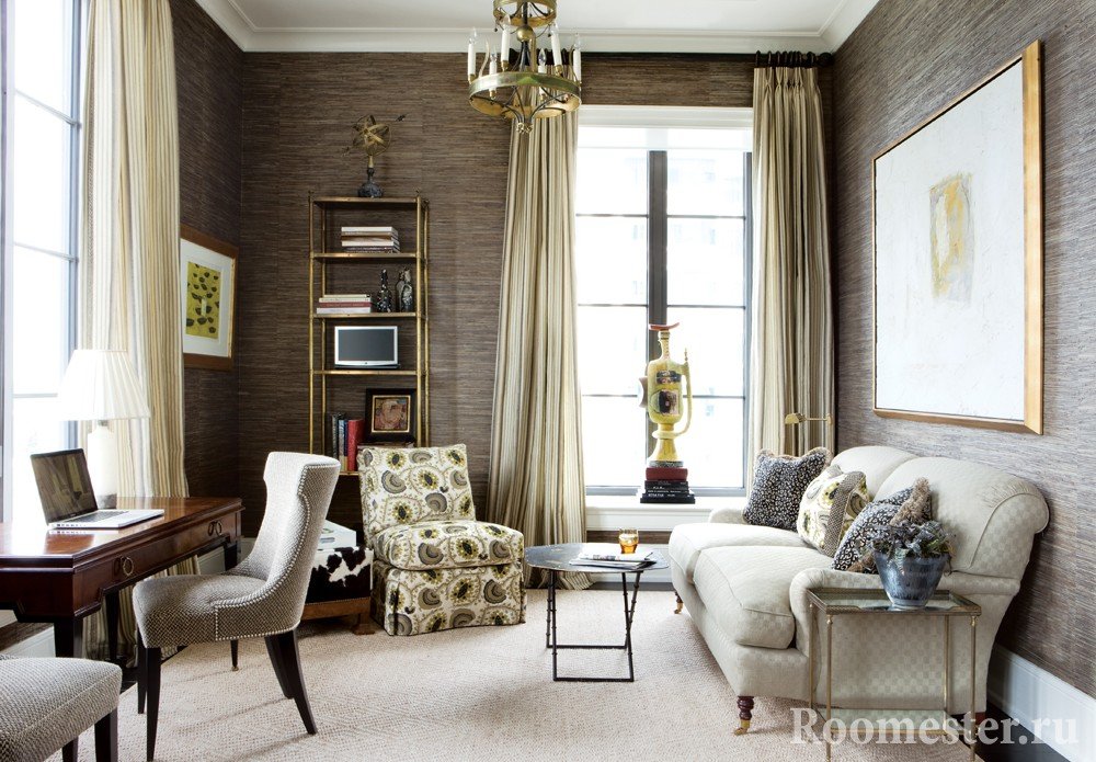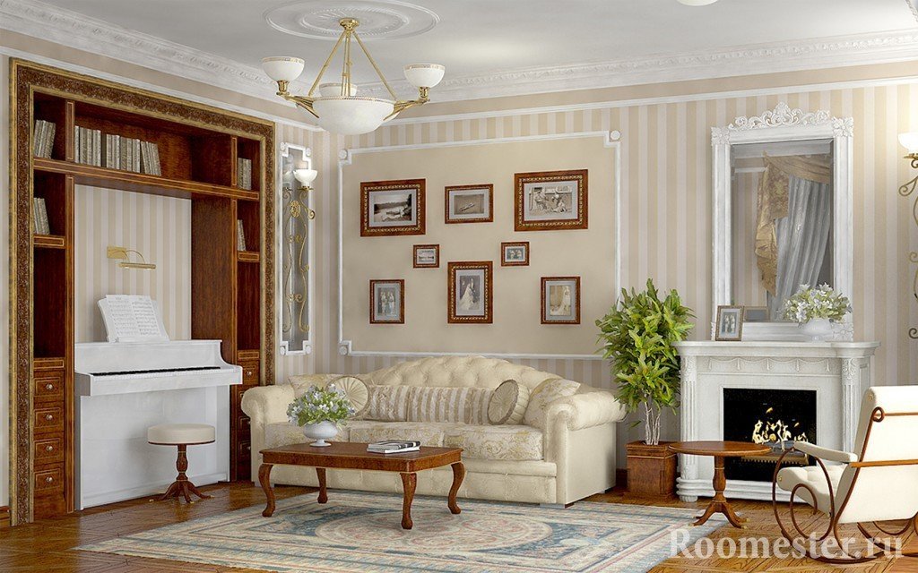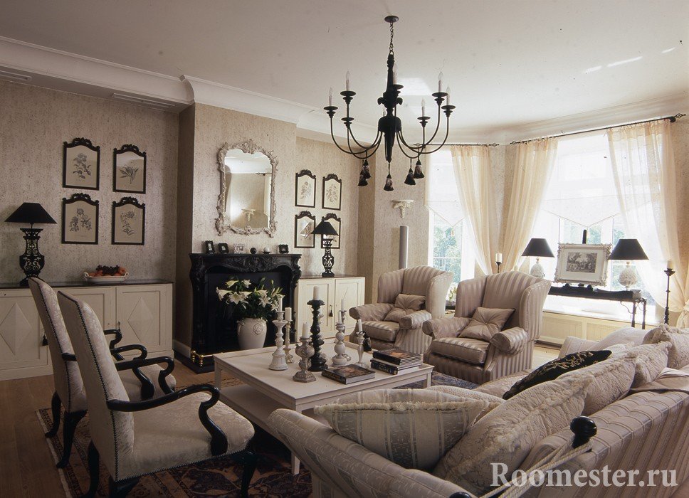 La combinación de madera y oro es ideal para la sala de estar. Pero también puede diseñar una habitación en colores delicados: marfil o gris noble será una base excelente, y acentos: plata, rosa, verde oscuro, cereza. Es muy elegante! Y no te olvides de los textiles: debería ser suficiente. Pesadas cortinas hasta el suelo con tul y lambrequines, alfombras, colchas para sofás y sillones, manteles, servilletas, literalmente en todas partes debería haber tela. Por supuesto, los textiles deben ser naturales y sofisticados.