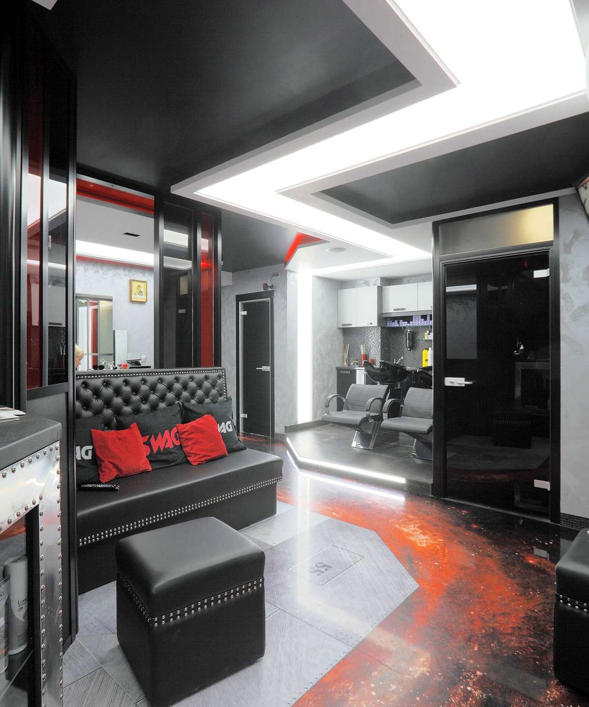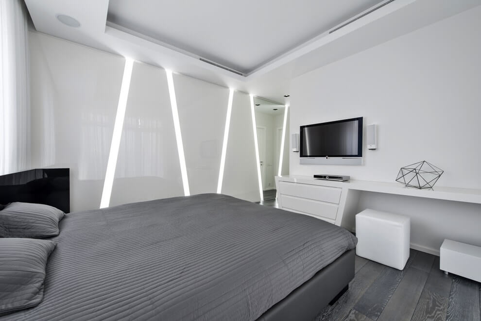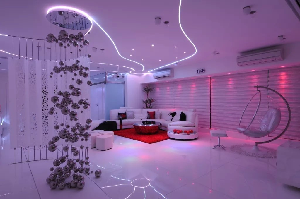 En colores de acento, prevalecen el azul, el cian, el violeta, el verde y el rojo. Todos los tonos tienen un brillo de neón "genial". Una buena opción es enfatizar el esquema de color con la luz de fondo adecuada. El fondo principal está hecho de tonos blancos, negros o grises. Son neutrales y se combinan con cualquier tono. El principio principal de las combinaciones de colores es el juego de contrastes. El énfasis debe ser sorprendente, pero su equilibrio está estrictamente regulado.