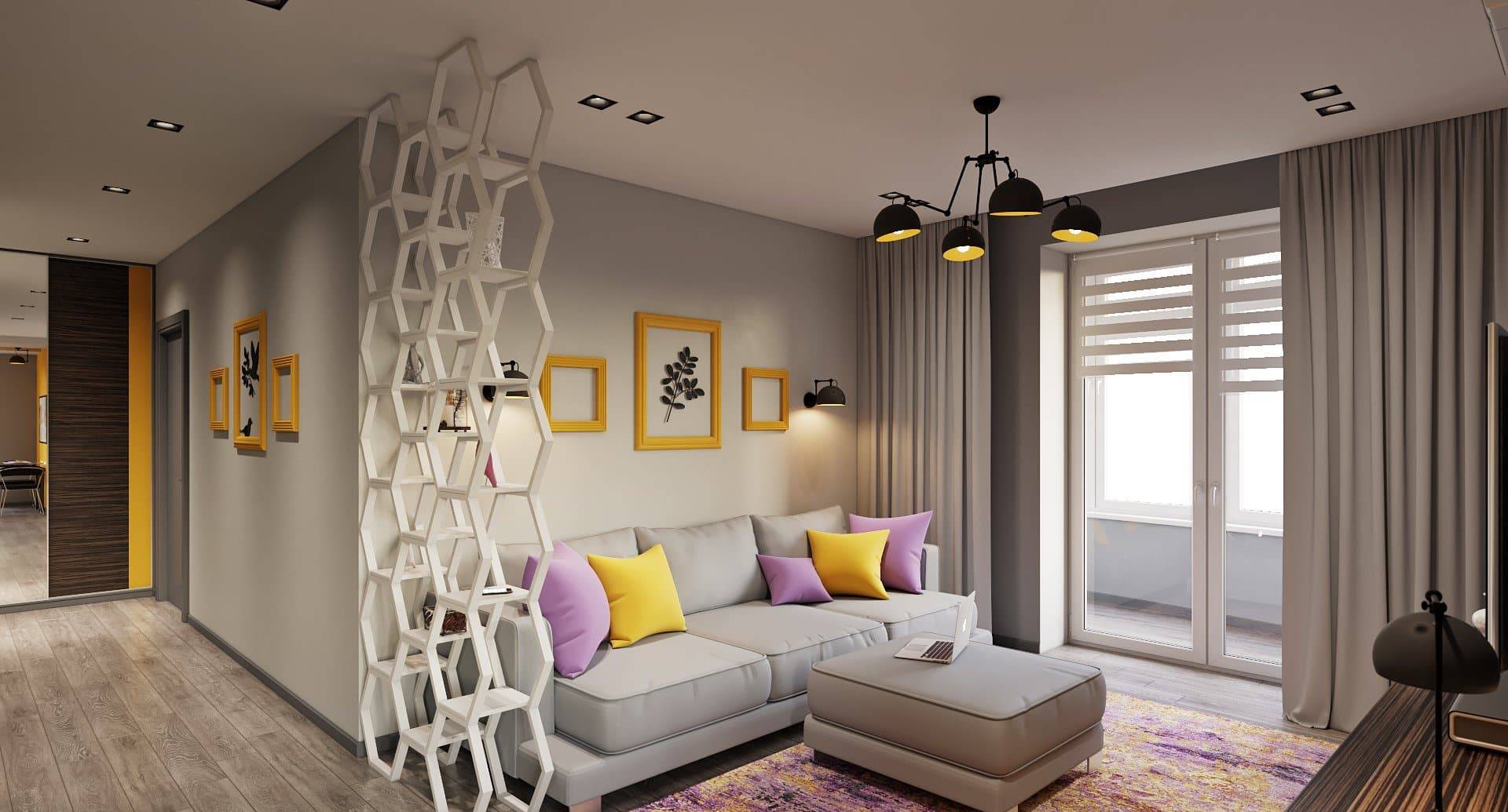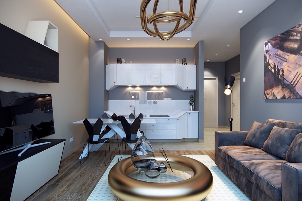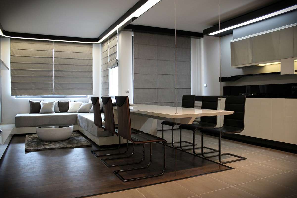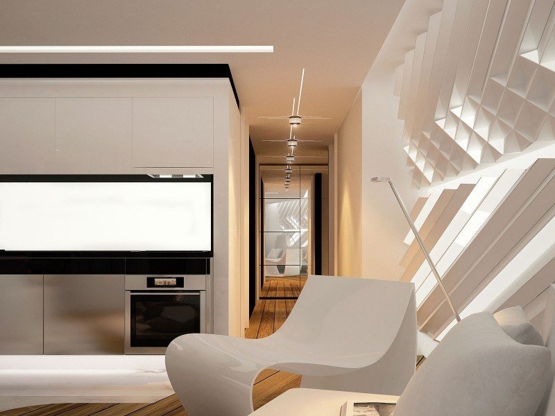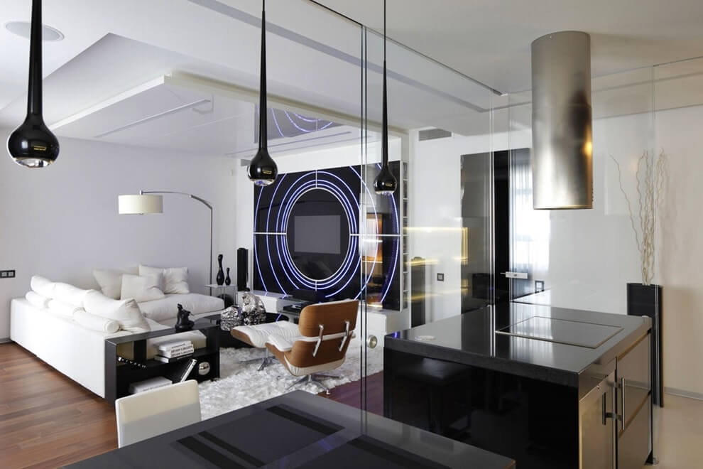 La presencia de particiones de vidrio para el espacio de zonificación.El apartamento ideal para encarnar ideas futuristas será un estudio o "odnushka", que se divide en sectores;