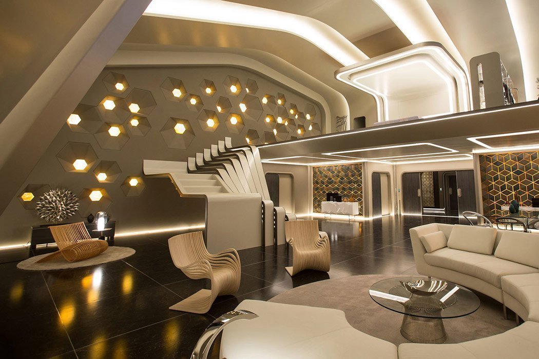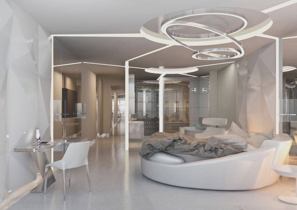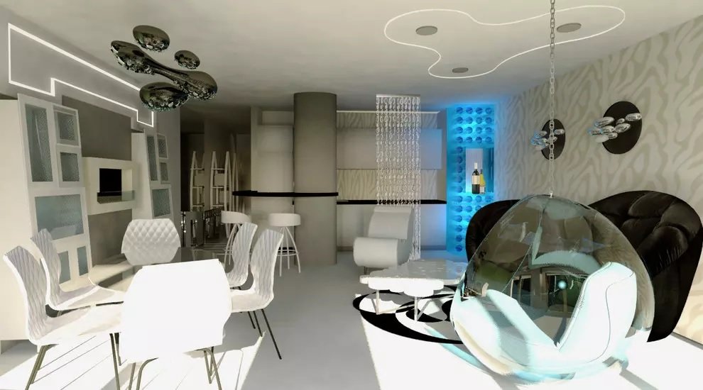 Los interiores futuristas se destacan de otros estilos populares. Vale la pena señalar que no todos son capaces de tomar decisiones tan audaces. Los conceptos familiares de comodidad y confort se transforman y adoptan formas inusuales a las que necesita acostumbrarse. La atmósfera futurista original parecerá muy similar al museo, donde muestran objetos de arte no triviales. El estilo se caracteriza por: