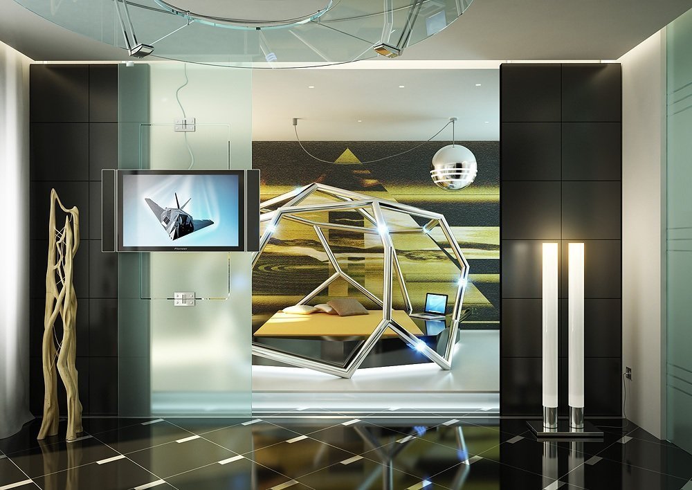 La decoración en el entorno es mínima. Sin embargo, aquellos detalles que aún están presentes, su originalidad compensa con creces la escasez de joyas. Look futurista de cuadros gráficos o collages en las paredes. Relojes inusuales están dispuestos en la habitación, en forma de moléculas de ADN, celosías de cristal, péndulos, instalaciones hechas de átomos y burbujas de aire, composiciones de espirales de alambre, bolas de vidrio en las patas: todos estos elementos oscuros, pero a su manera hermosos, actúan como la decoración principal. .