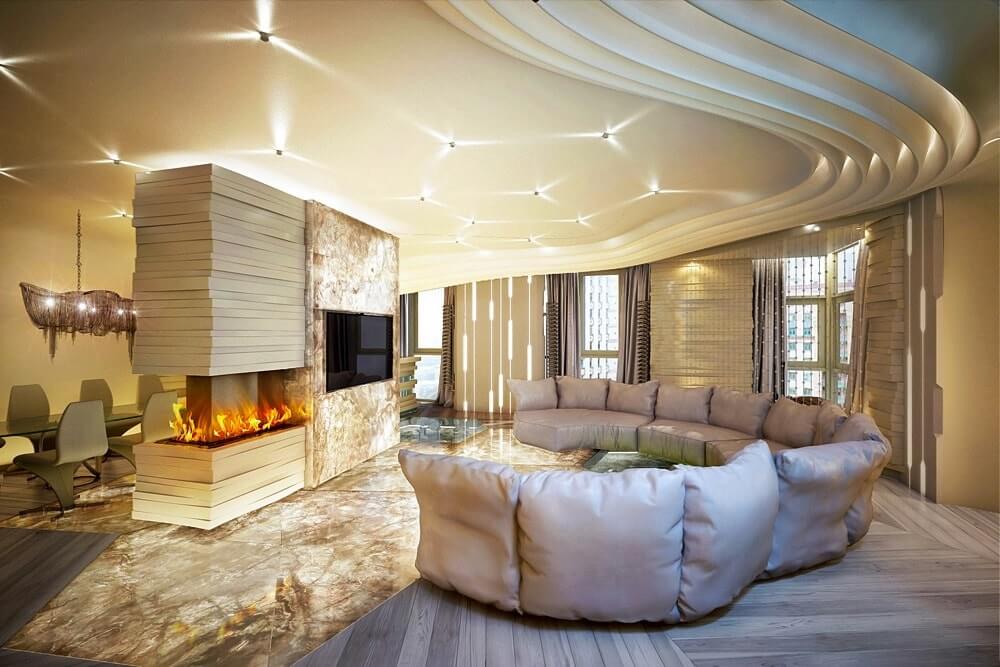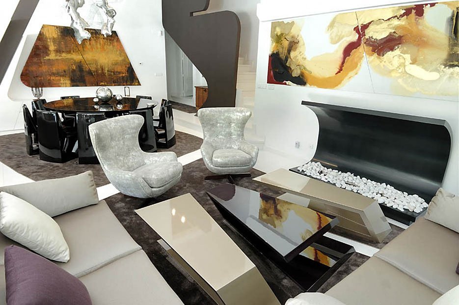 El estilo se considera universal. Se ve orgánicamente en cualquier habitación: cocina, sala de estar, dormitorio, pasillo, baño e incluso una habitación para niños. Sin embargo, los propietarios deben prepararse para una reparación costosa, ya que la implementación de ideas extraordinarias requerirá grandes inversiones. La decoración está dominada por materiales artificiales que se ven lujosos, pero de ninguna manera baratos o primitivos.