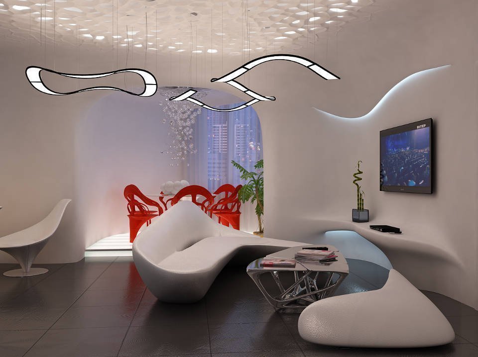 Al elegir muebles se guían por su funcionalidad. Los sofás se transforman en camas, armarios en mesas y estanterías en sofás. Las opciones de transformación más inusuales son bienvenidas en el interior futurista. Los muebles modernos con estructuras articuladas sin patas son relevantes. "Volar" en el espacio de camas, sillas y mesas no solo facilitará la limpieza de los pisos, sino que también creará la ilusión de ingravidez. Al elegir un entorno, se guían por formas extraordinarias que enfatizarán las características interiores. Sofás semicirculares, pufs de bolas, huecos dentro de la silla, estantes ondulados con bisagras, gabinetes de radio y mesas de café, más reminiscencias de gemas pulidas, aspecto orgánico.