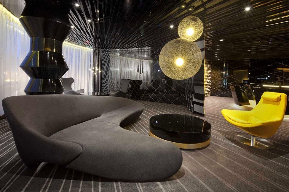 Los dispositivos de iluminación se colocan en el techo, alrededor del perímetro de la habitación, en nichos decorativos de muebles y paredes, en mesas y en el piso. La luz artificial se considera la fuente principal. Las pantallas tienen las mismas formas no estándar que los muebles. Los resortes de las patas sostienen "cuencos" absolutamente redondos o elipsoidales. Se presta especial atención a las fuentes puntuales de luz dispersa. Se colocan en grandes cantidades, y el brillo generalmente no es blanco estándar, sino un tinte para combinar tonos de acento en áreas específicas de la habitación.
