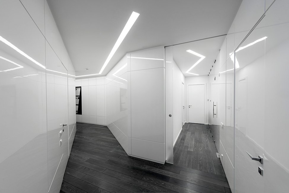 Iluminación artificial. En el concepto de futurismo, los contactos con la naturaleza están completamente rotos. Todo lo que queda para una persona es una casa aislada, en la que se mantiene la iluminación artificial durante todo el día. Habrá poco sol en las habitaciones;