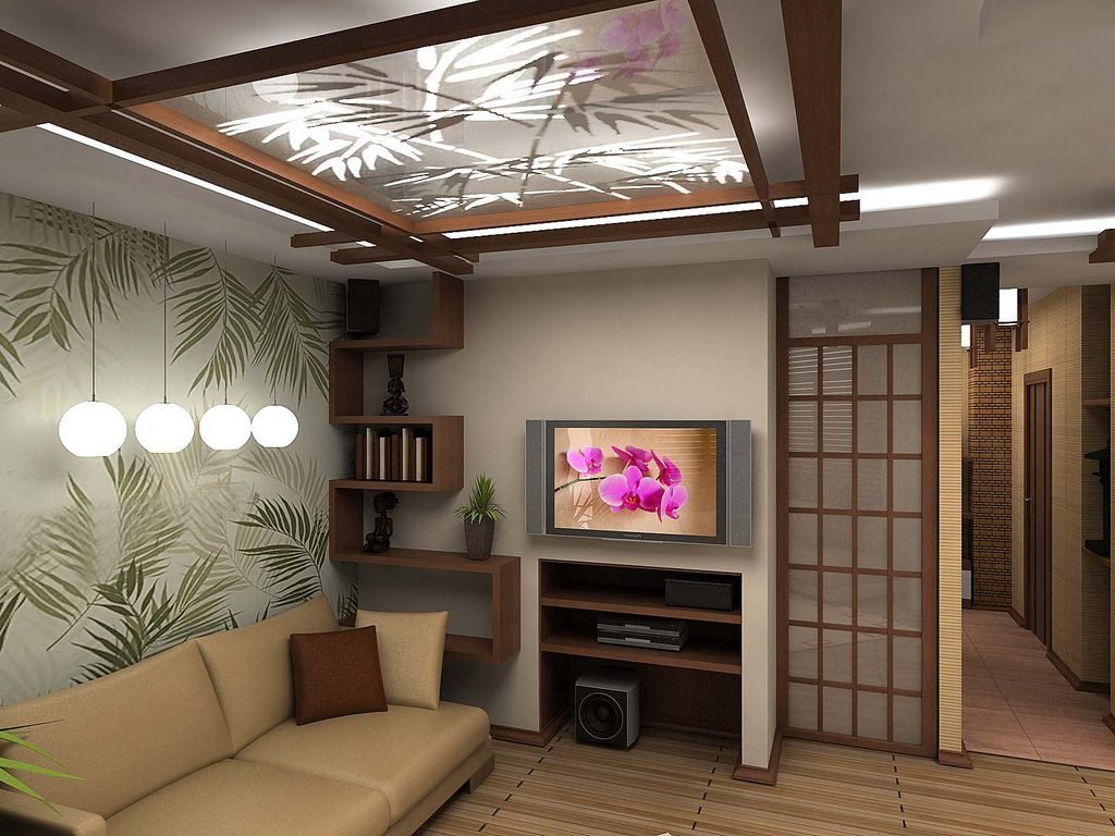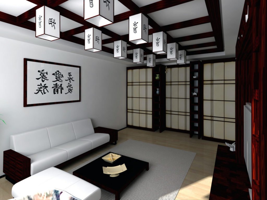 Por supuesto, en una casa moderna puede usar el techo de tela elástica, simple y suave habitual. Si lo desea, puede aplicarle una imagen de estilo chino: una flor de sakura, un dragón o varios personajes. Tal techo creará el estado de ánimo necesario y complementará el estilo.