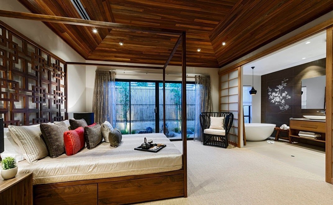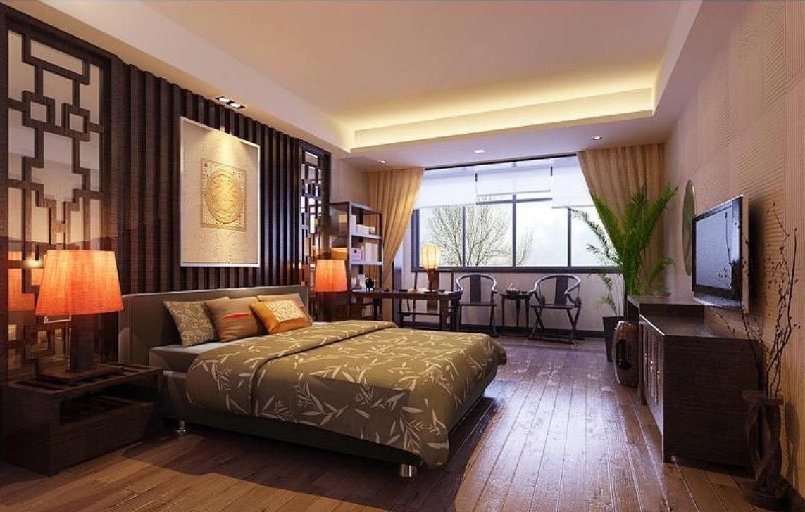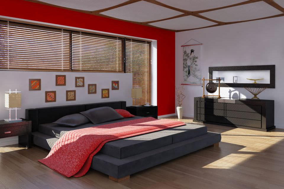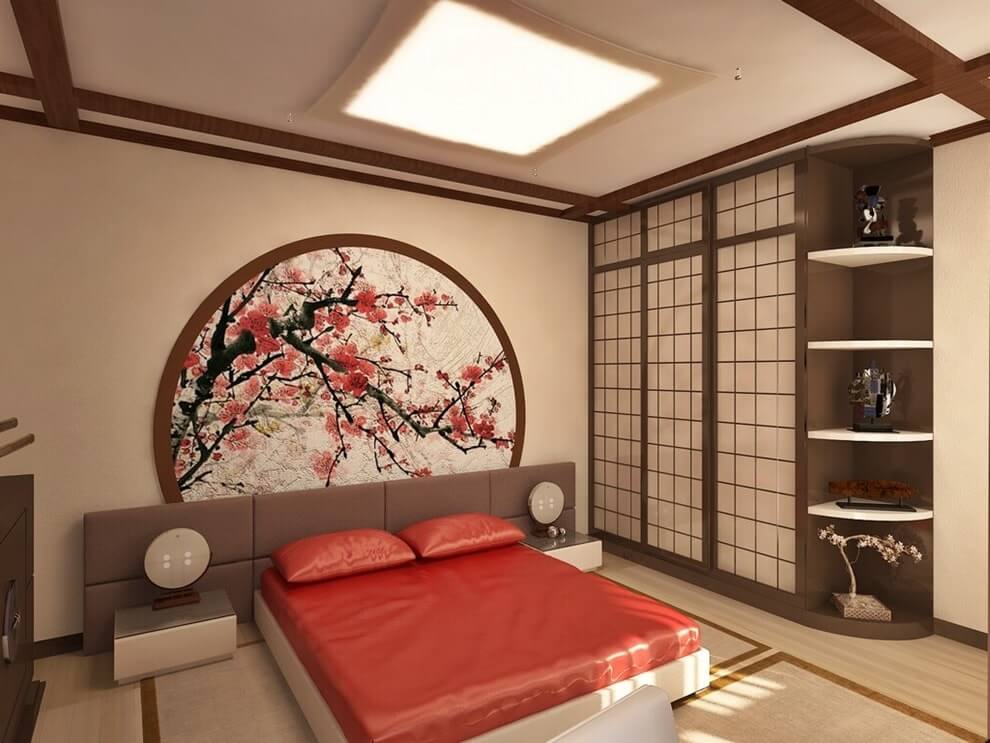 Si no es posible llevar el elemento principal del estilo a la habitación, puede usar una variedad de decoraciones que enfatizan su estilo: coloque una pantalla, bloquee el lugar para cambiarse de ropa, cuelgue un gran ventilador con la imagen de grullas volando sobre la cama. Será útil colgar fotografías o una imagen que represente un loto en la pared: la flor representa la perfección y la armonía.