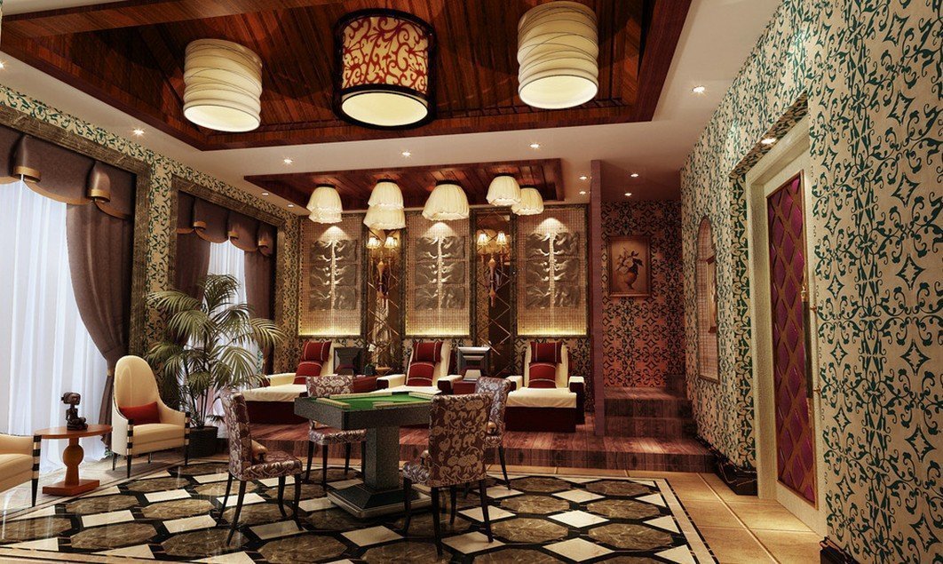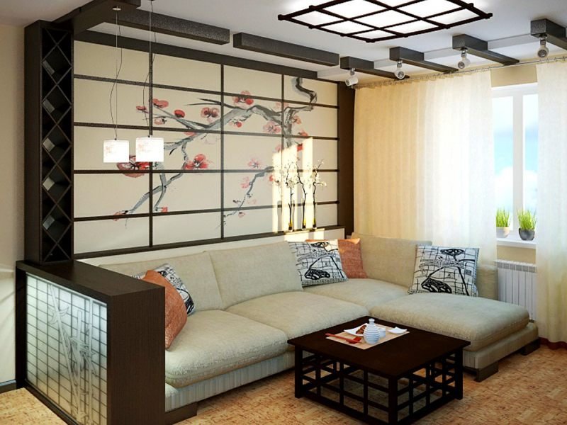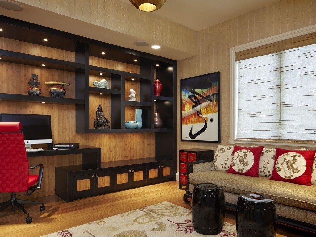 Sin embargo, las paredes estaban decoradas con la mejor seda escarlata, las alfombras rojas alardeaban en los pisos y los muebles bajos estaban decorados con brillantes almohadones dorados. Los accesorios textiles pueden desempeñar el papel de acentos de color. Las almohadas pueden ser azules, amarillas o verdes con patrones negros u dorados. Los textiles también se pueden atribuir a las pantallas cubiertas con la tela pintada más fina, que sirven para delimitar zonas en la habitación.