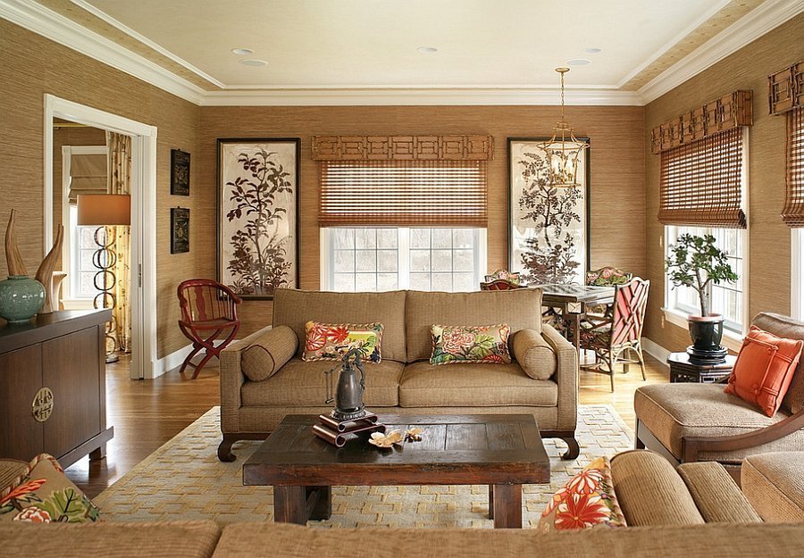Sin embargo, nada malo sucederá si decides que el rojo actuará de manera emocionante en ti. En cambio, puede organizar un fondo marrón que combine bien con tonos crema, beige y leche. Tales colores a menudo se encuentran en los interiores modernos del Imperio Celestial. El resto de la vivienda debe cumplir con los cánones del estilo de la casa: un mínimo de muebles simples pero caros, una cantidad suficiente de decoración colorida.