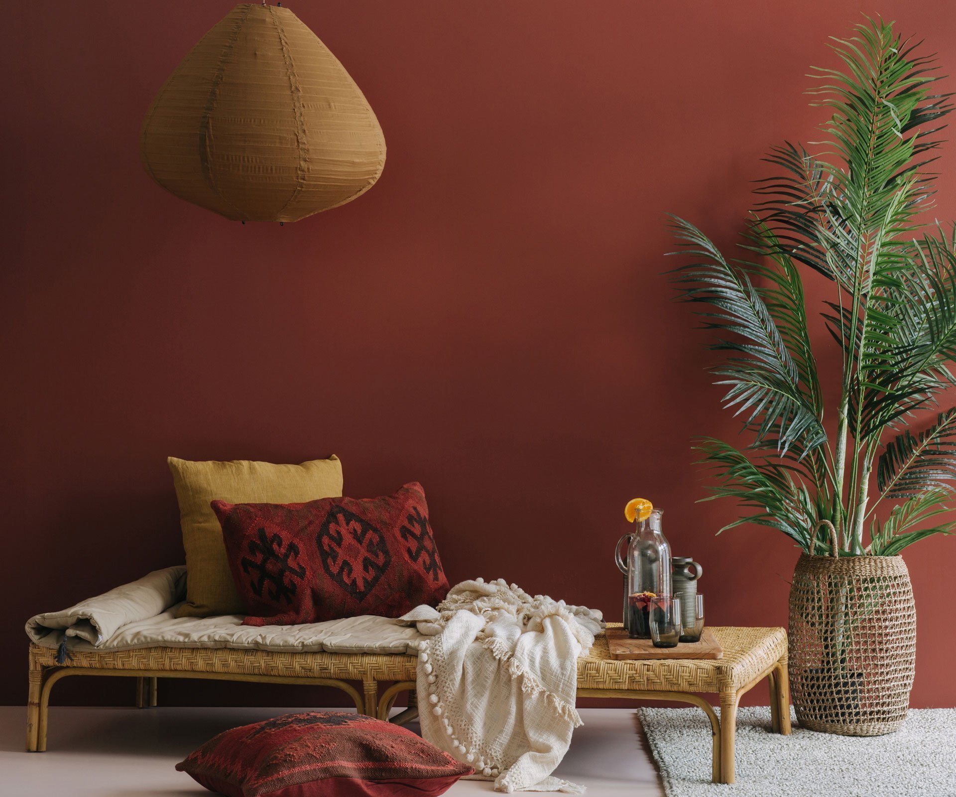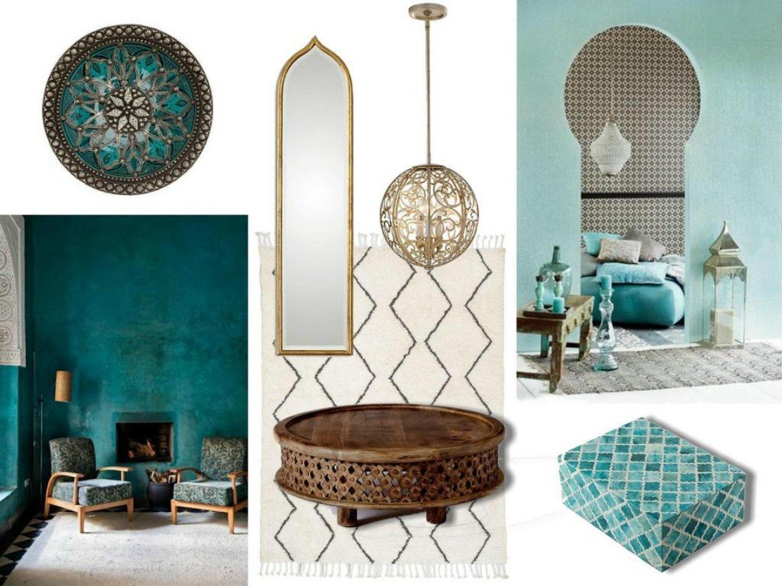 La base del esquema de color son los colores cálidos. Los interiores marroquíes son brillantes y coloridos, pero al mismo tiempo la decoración no carece de gracia oriental.Rojo, rosa, burdeos, vino, coral, fucsia, melocotón, amarillo, marrón prevalecen en la paleta de colores. La influencia de Oriente se puede rastrear en el uso de azul, cian, lila, turquesa. Para la decoración de interiores, se utilizan combinaciones tradicionales como rojo con oro (amarillo), celestial y naranja. Mediante el uso de colores lujosos, el estilo reclama un alto lujo, similar a la elegancia del barroco y el rococó. Las ideas para decorar habitaciones provienen de la naturaleza misma: una puesta de sol rojo anaranjado, arena amarillenta pálida, desbordamientos de aguamarina, oro de extensiones ilimitadas en el horizonte.