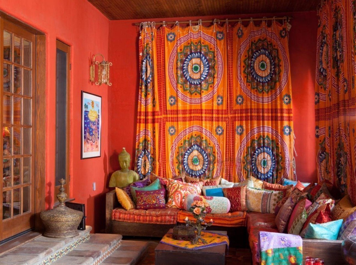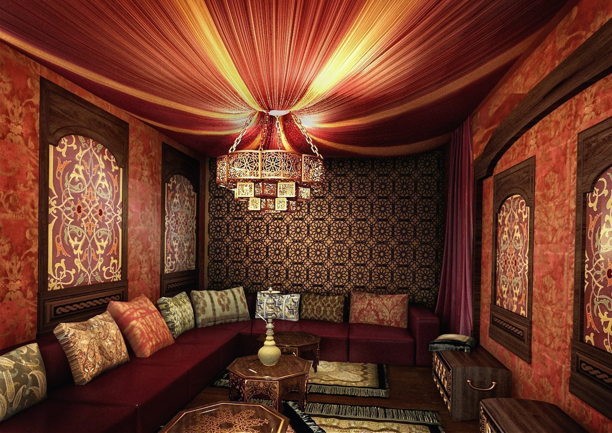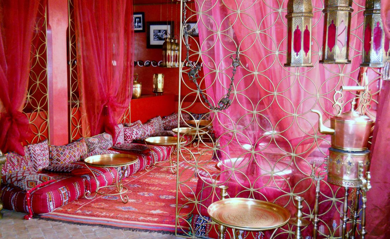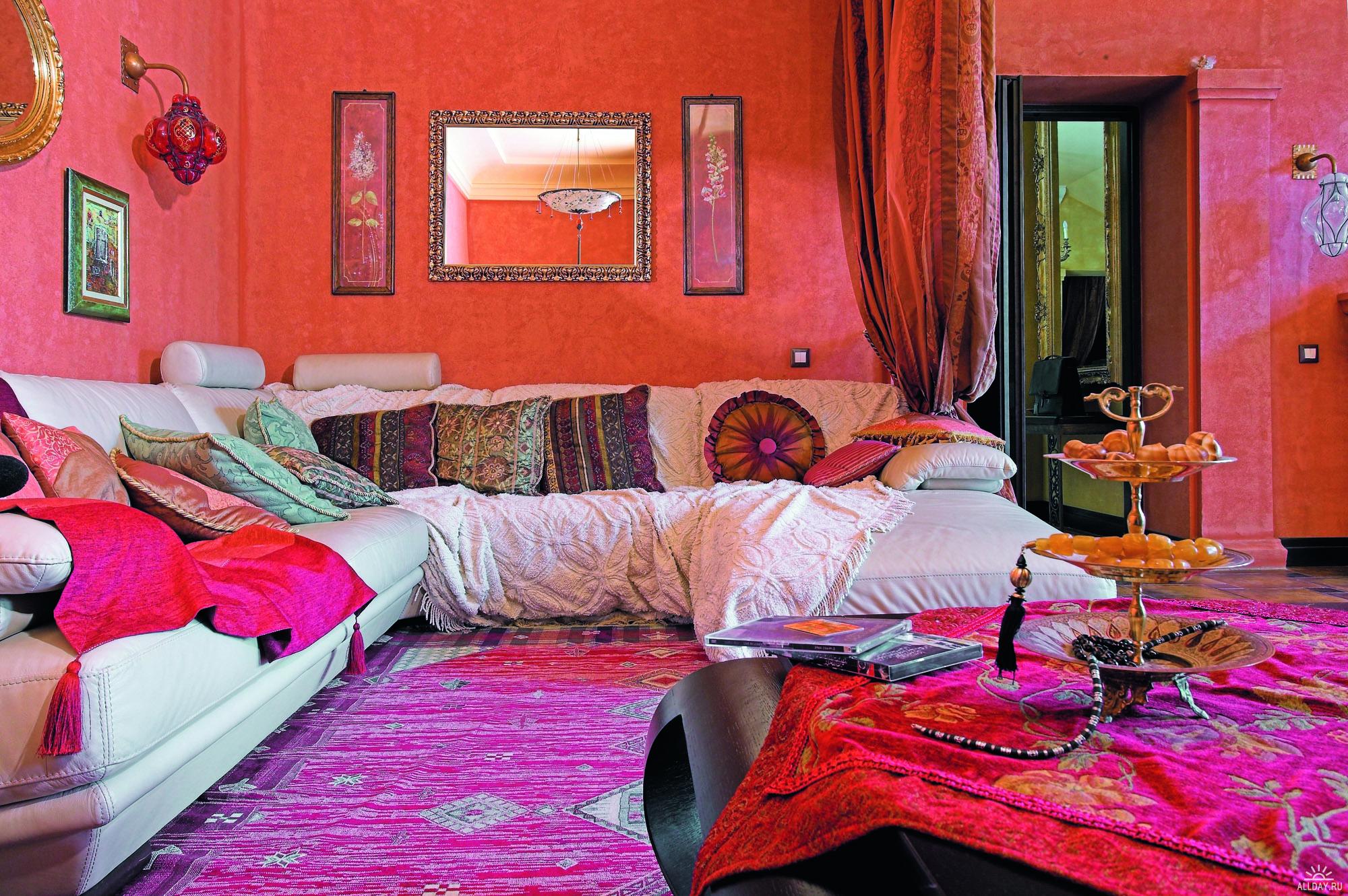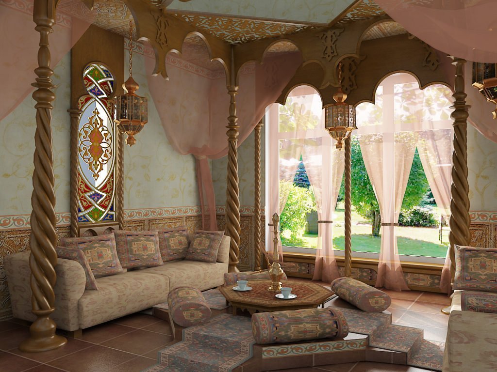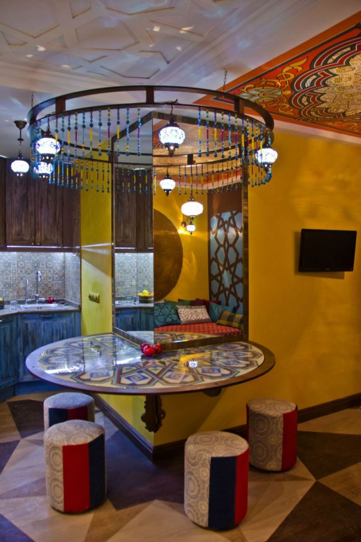 Muebles pequeños. El lujo y el color de la atmósfera se logran debido a la abundancia de textiles y una paleta de colores. Los muebles se quedan en el camino y son significativamente "más pequeños", es decir, solo se utilizan pufs, mesas bajas y sofás. Como opción, el asiento puede estar hecho de almohadas colocadas directamente en el piso.