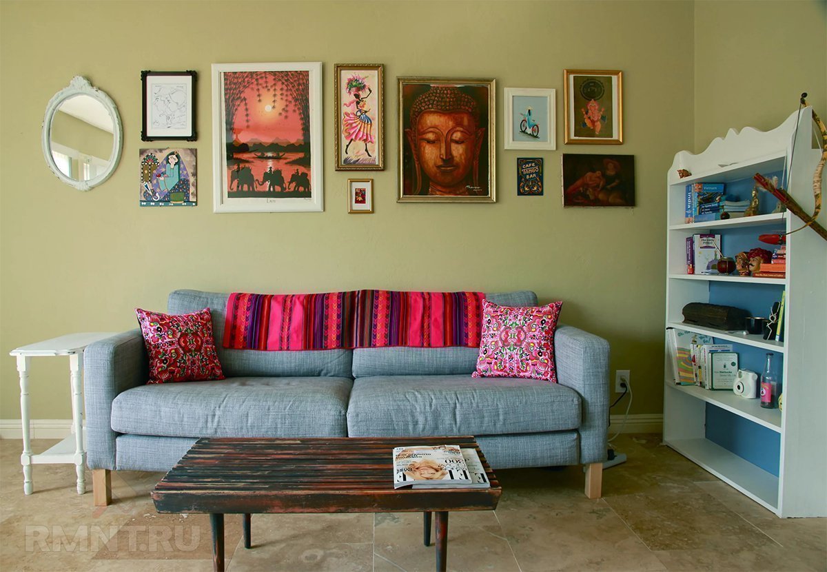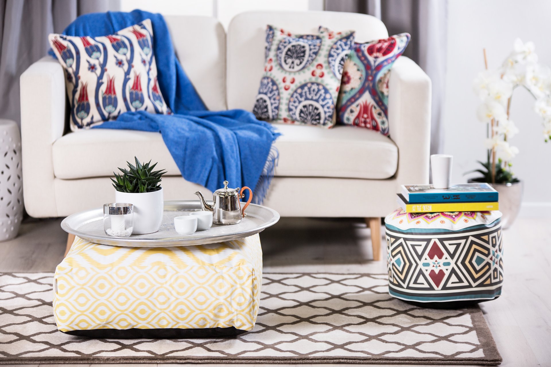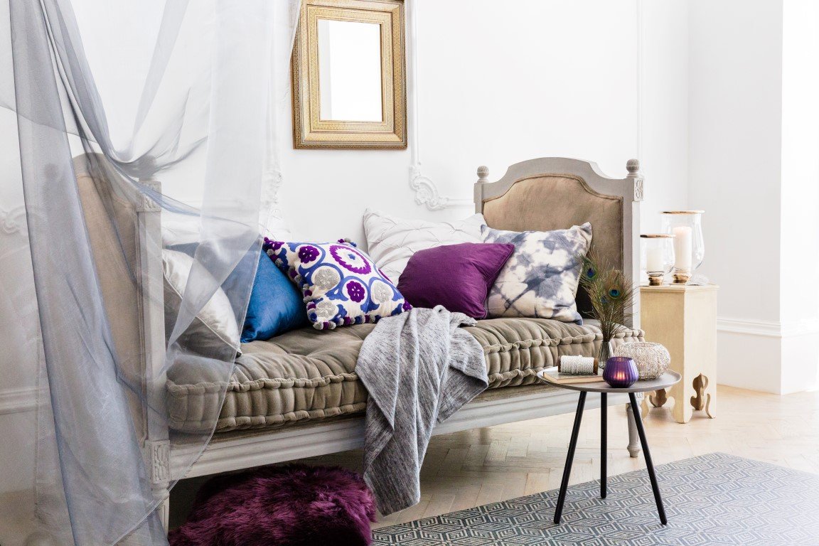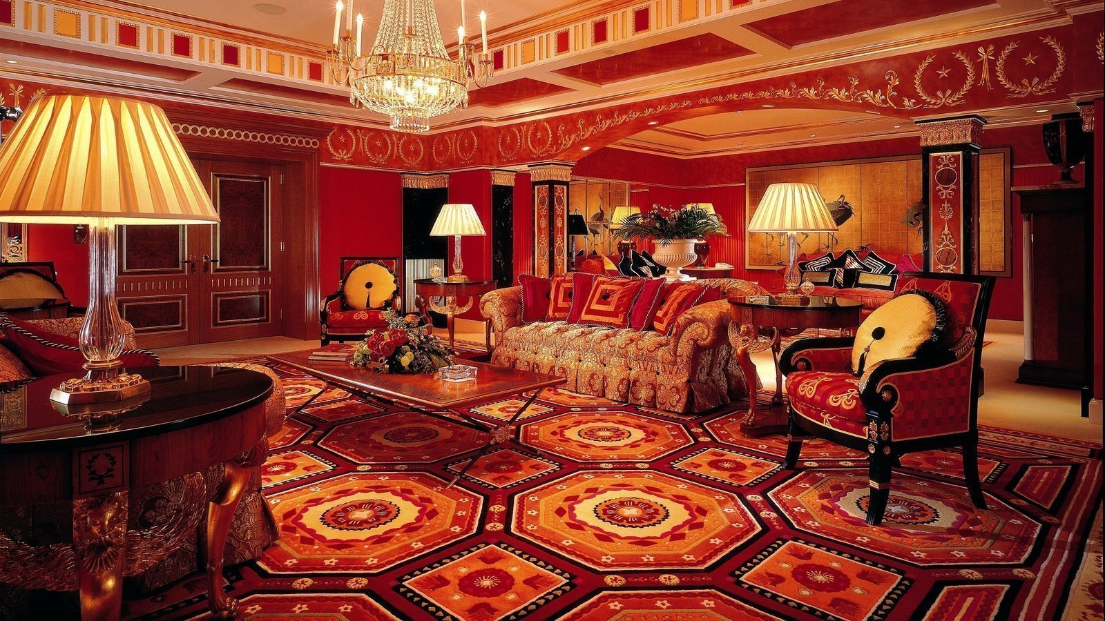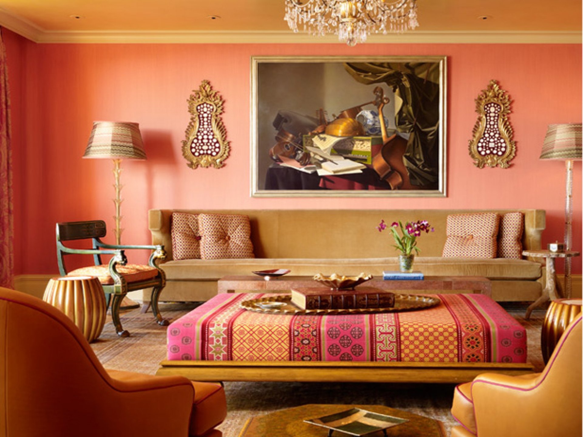 Muebles pequeños. El lujo y el color de la atmósfera se logran debido a la abundancia de textiles y una paleta de colores. Los muebles se quedan en el camino y son significativamente "más pequeños", es decir, solo se utilizan pufs, mesas bajas y sofás. Como opción, el asiento puede estar hecho de almohadas colocadas directamente en el piso.