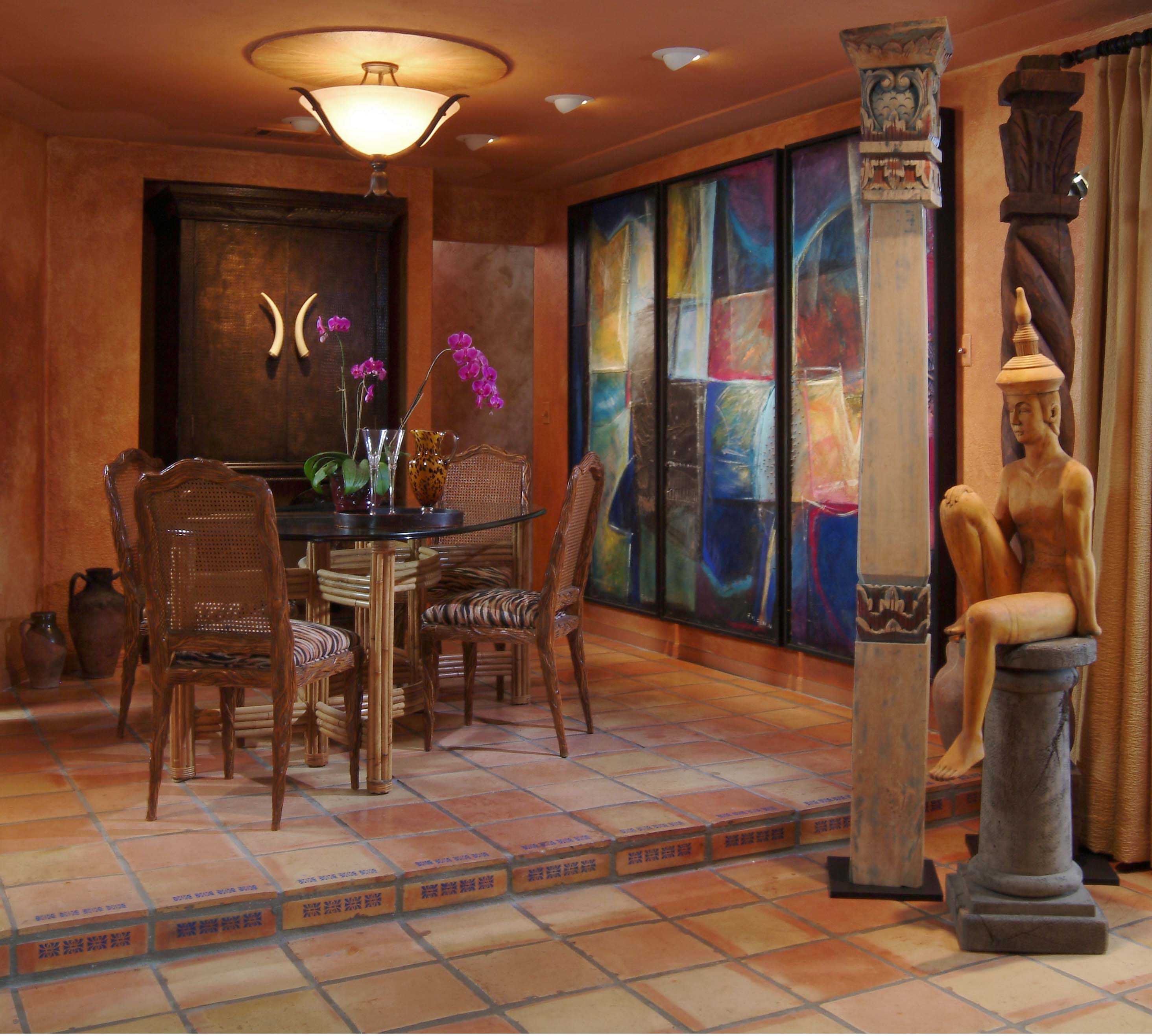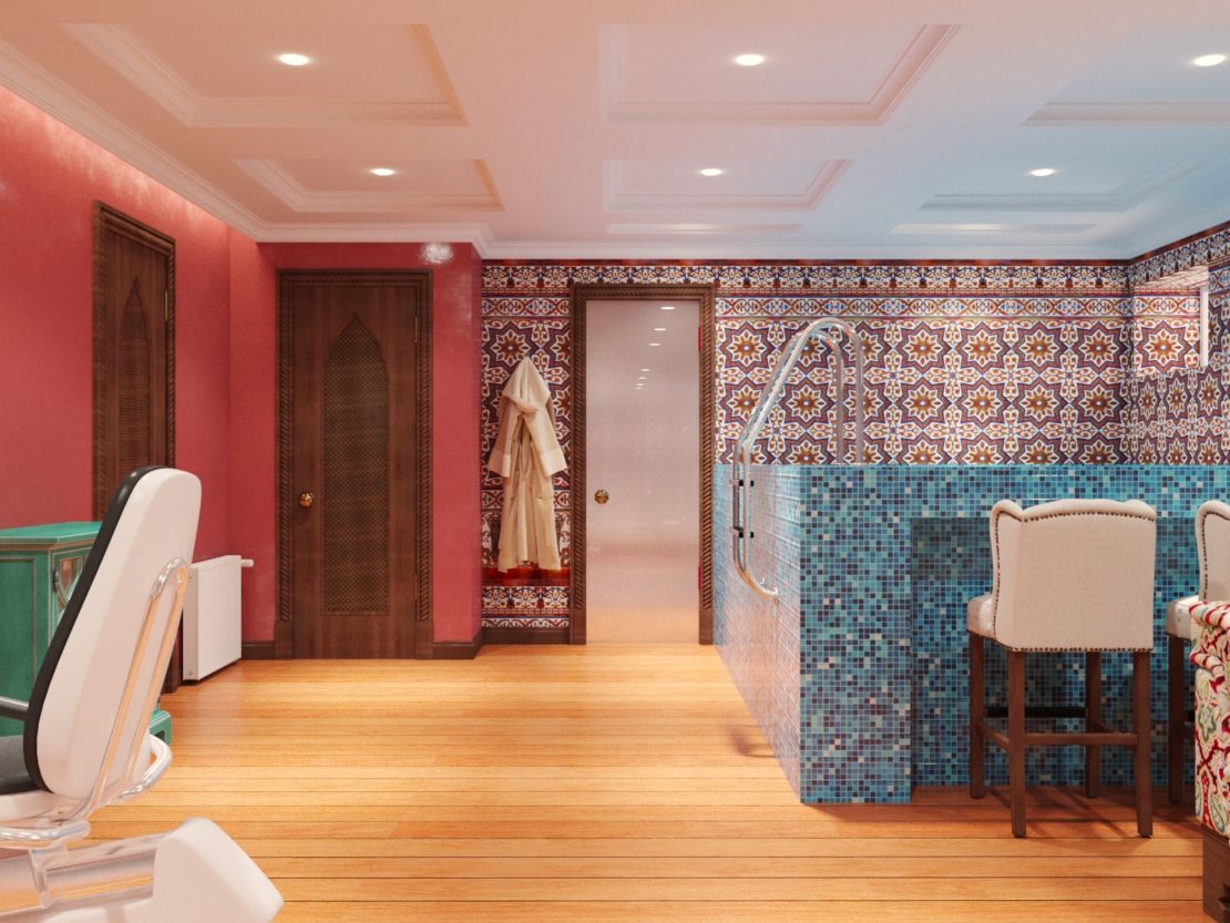 Se utiliza vidrio coloreado en la decoración. (mosaico), azulejos vidriados con patrones orientales originales, abundantes textiles coloridos, madera, piedra.
