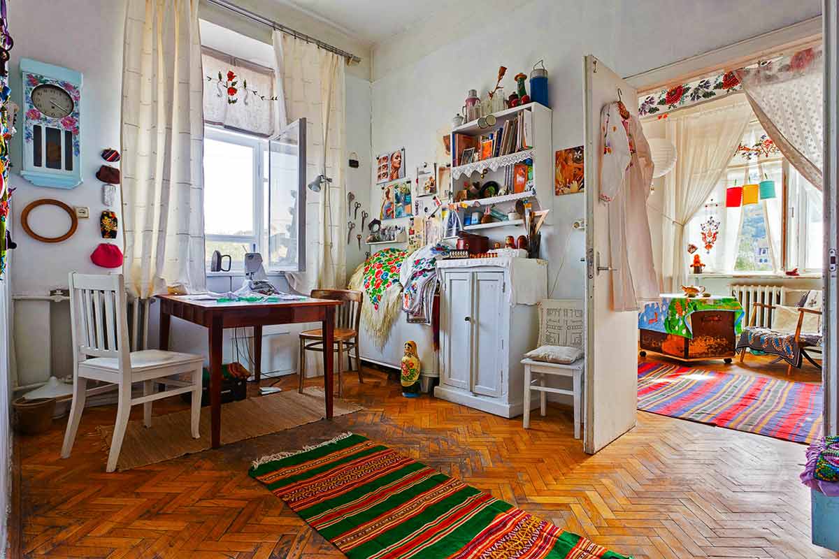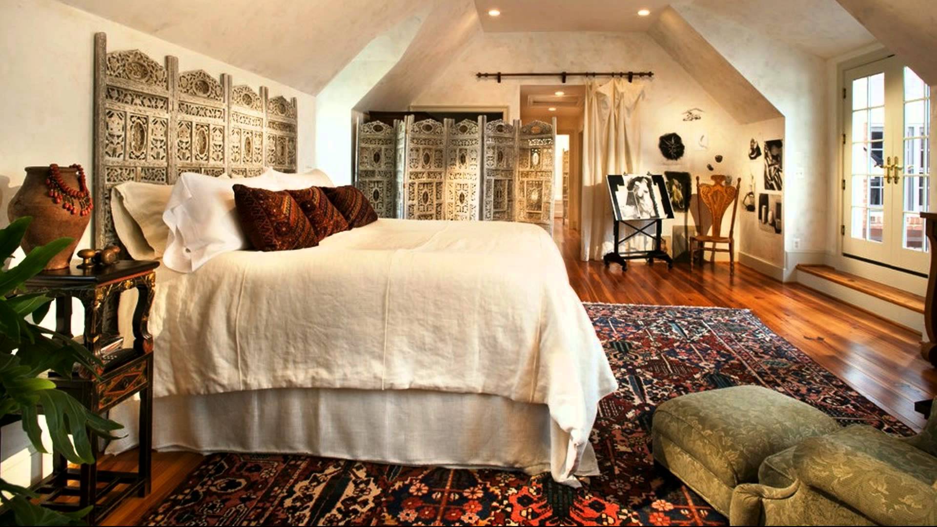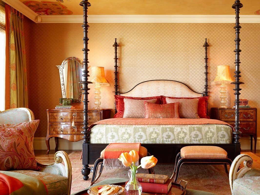 La decoración está hecha exclusivamente de materiales naturales. El estilo se remonta a la época en que el plástico y los compuestos simplemente no existían. Los materiales están dominados por metal, vidrio, madera y arcilla. Por cierto, hay pocos elementos decorativos utilizados, porque la pintura lujosa en las paredes y los tonos abigarrados hacen que los interiores sean brillantes y originales. Los sofás y las camas están decorados con numerosas almohadas, entre las cuales hay elementos de formas alargadas, tradicionales del este.
