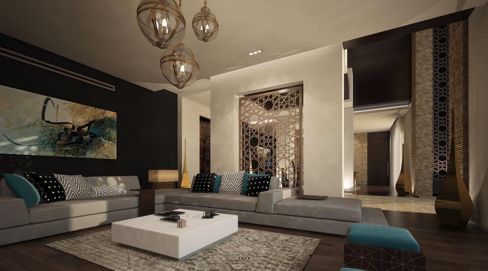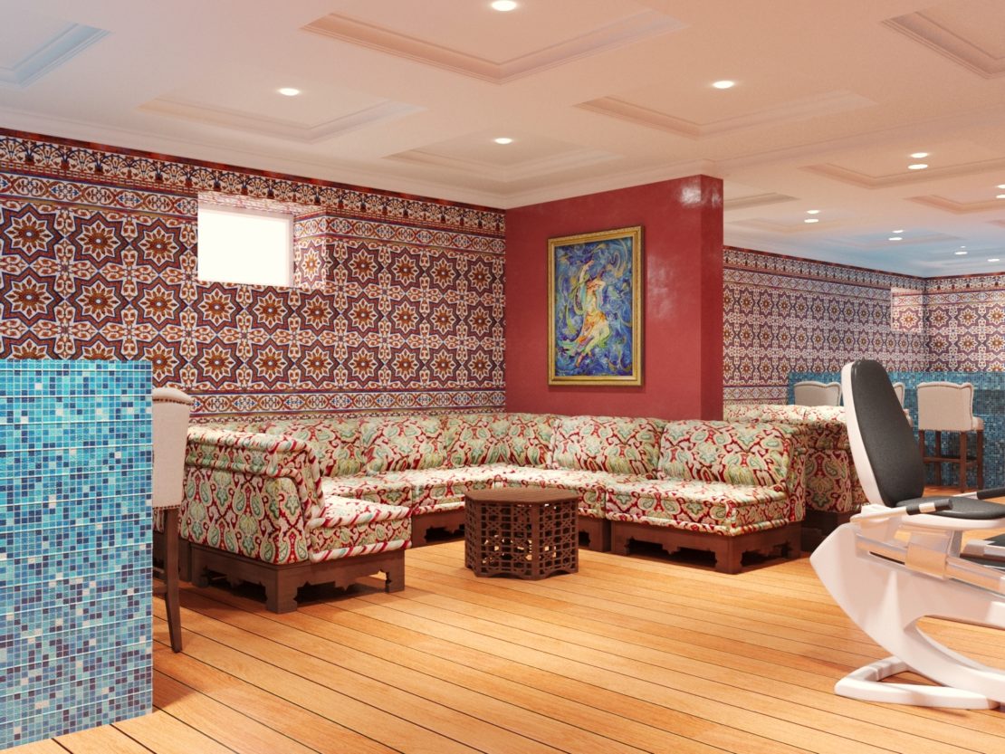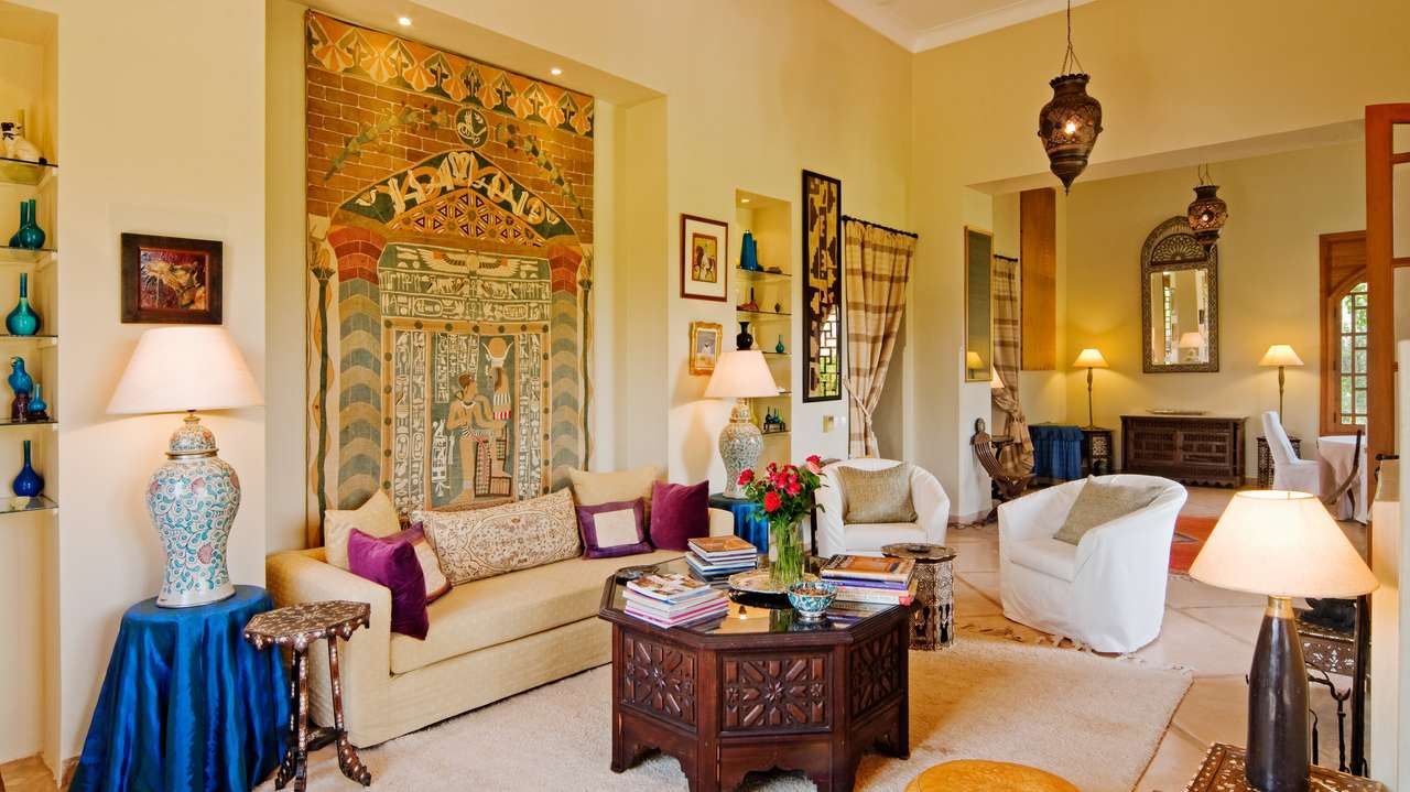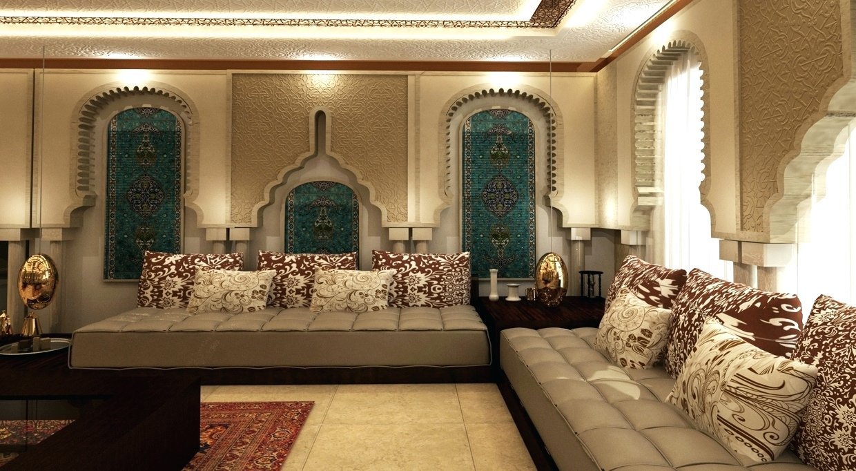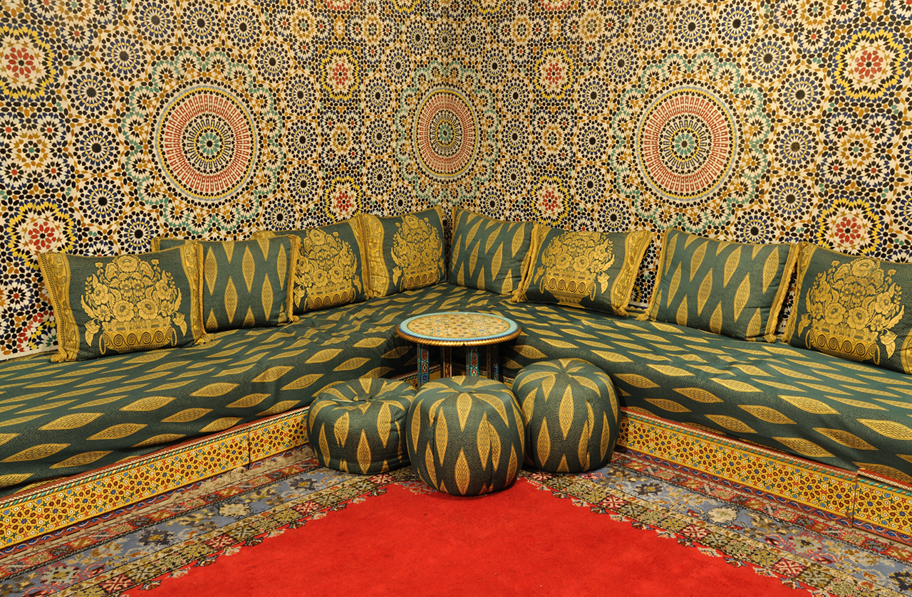 La sala de estar se considera una habitación favorita de los marroquíes, ya que es allí donde se reúnen los visitantes y los hogares. Un atributo requerido para esta sala es un sofá. Debe ser lo más largo y grande posible. Si las dimensiones de la habitación lo permiten, entonces está decorada con un sofá "serie" alrededor del perímetro. Las ventanas están cubiertas con cortinas gruesas y cortinas de aire. Las paredes están decoradas con paneles tallados, azulejos de cerámica, apliques, nichos con decoraciones temáticas. El techo está soportado por columnas decorativas.