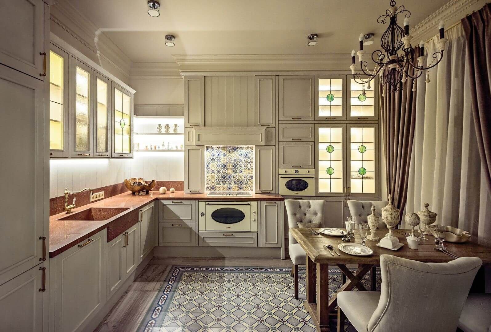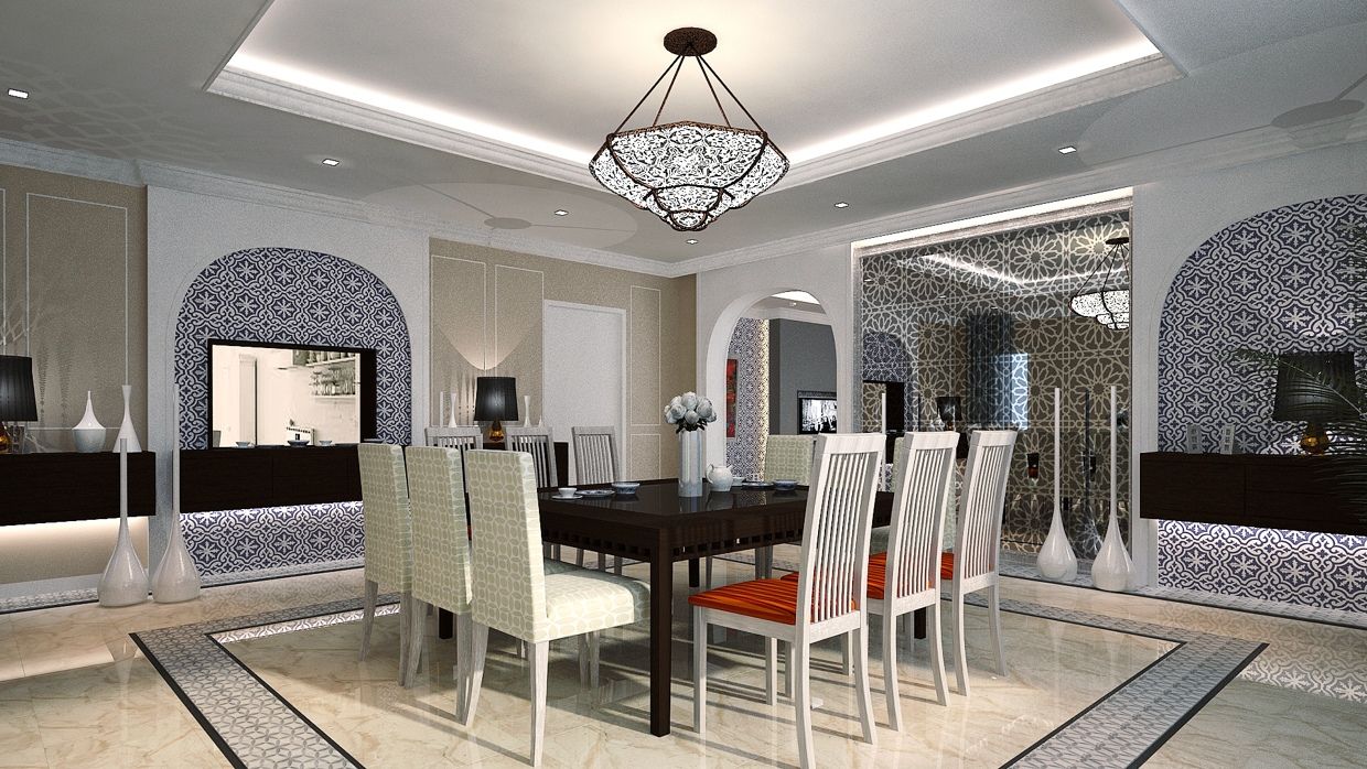 Si la cocina se combina con el comedor, se cuelga sobre la mesa un grupo de lámparas marroquíes de varias formas con un "marco" de metal. Las sillas están hechas de madera tallada. Completa el diseño con un par de macetas con plantas de interior.