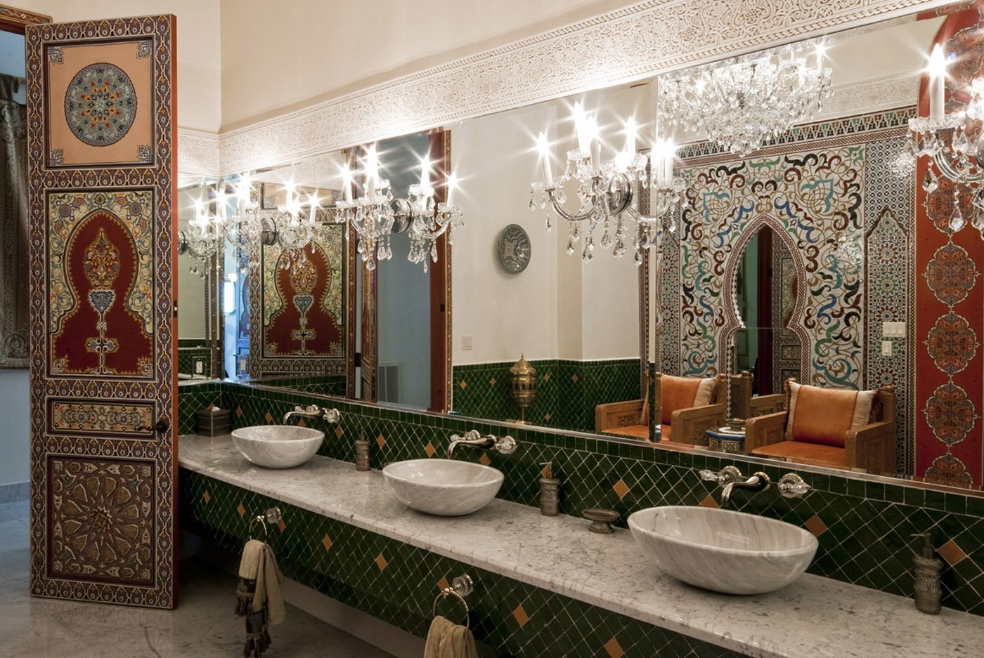 Las paredes y el piso del baño de estilo marroquí están terminados con azulejos finos con un adorno tradicional. Las modernas cabinas de ducha se abandonan en favor de una lujosa bañera. El fregadero usa una factura. La decisión original será comprar un espécimen de piedra, que destaca por su alto costo, pero al mismo tiempo durará décadas.Las fachadas de los armarios para guardar toallas y artículos para el hogar están decoradas con una fina celosía. Si los techos son altos, se agrega una estructura de marco abovedado sobre el baño, complementada con estantes abiertos a los lados.