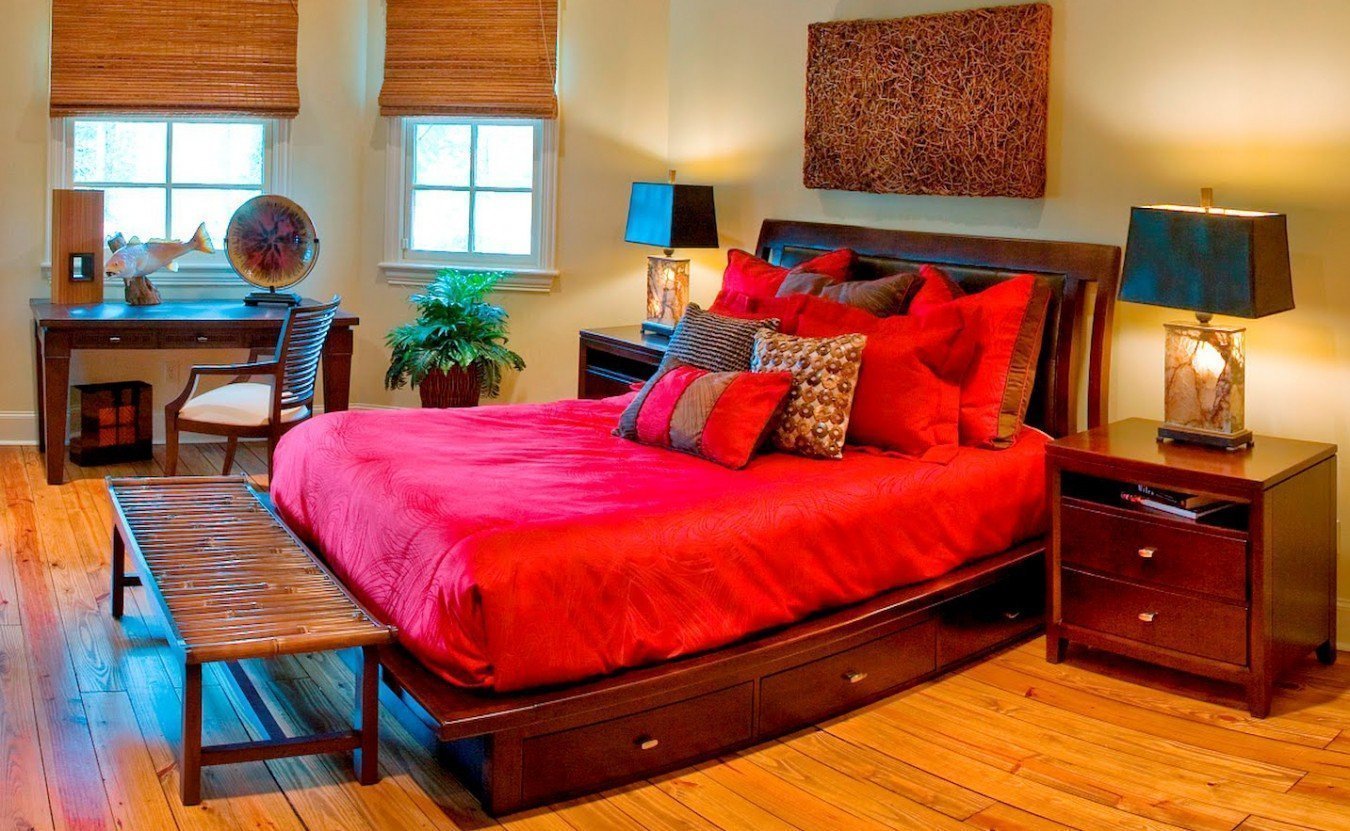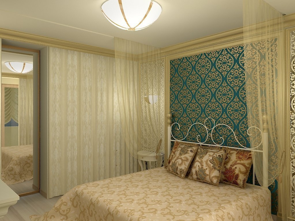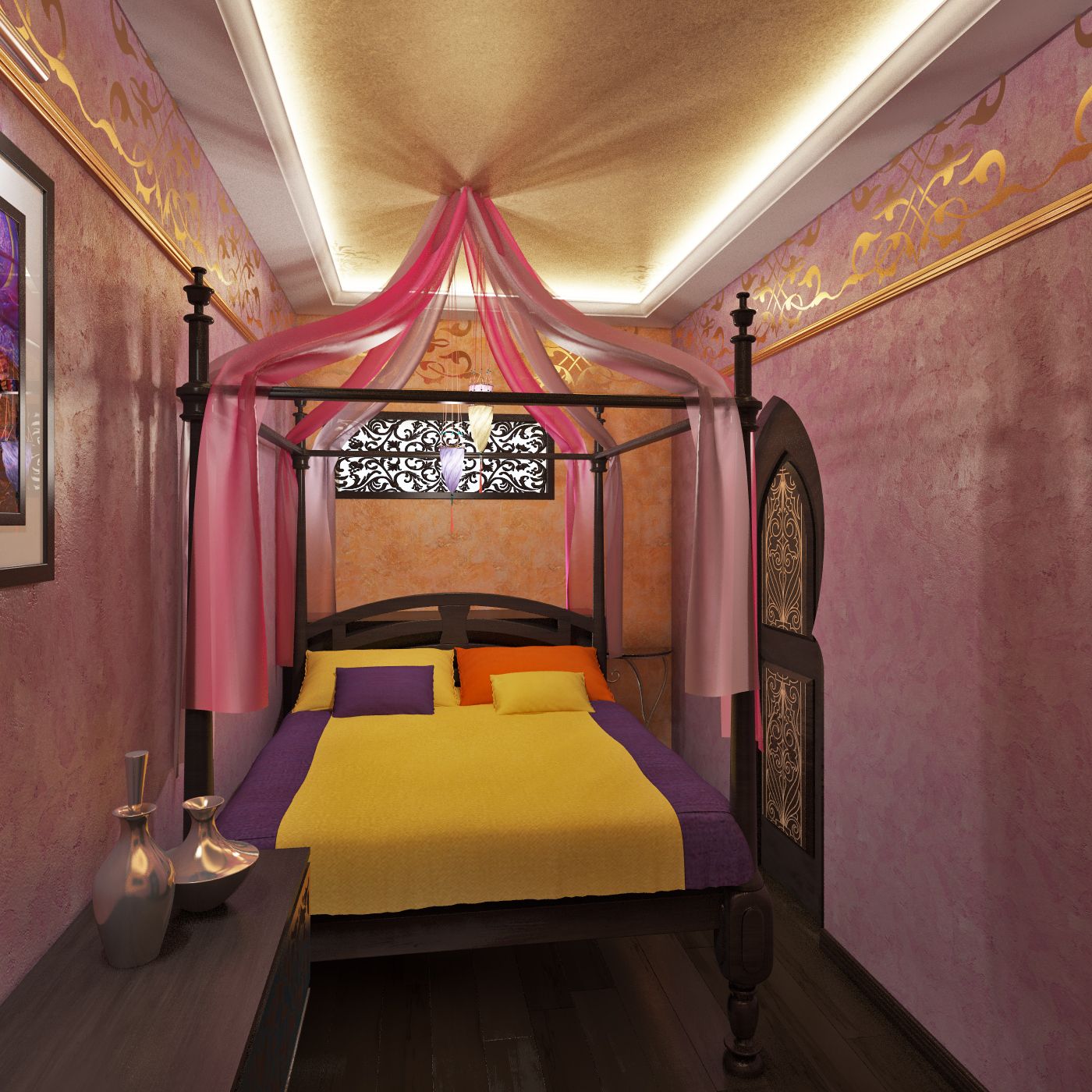 La habitación marroquí, como otras habitaciones, tiene un conjunto mínimo de muebles: una cama amplia, un par de mesitas de noche y una mesa. Si la habitación es espaciosa, se ubica cerca un sofá tradicional (sofá, cama de caballete) con una mesa de café. La pared decorativa en la cabecera de la cama está decorada con un nicho, que tiene una cúpula oriental tradicional con una punta alargada. Está decorado con una composición de cerámica, vidrio, arcilla o elementos de madera. Un pequeño candelabro corona el techo y se instala una lámpara simétrica a ambos lados de la cama. Las ventanas están decoradas con rejas de hierro forjado. Cúbralos con cortina de aire. El piso debe estar cubierto con alfombras. Moler la composición con una cachimba, plantas de interior en macetas, platos con frutas y dulces orientales en las mesas.