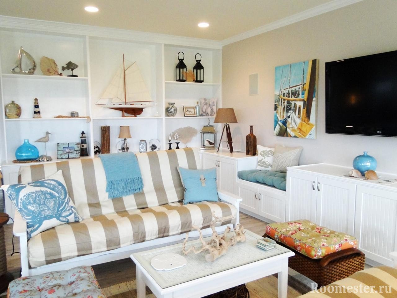 Las habitaciones decoradas en estilo marino usan marcos de fotos decorados con conchas, jarrones transparentes con cuerdas, estrellas de mar y otros artículos. Sin embargo, no se aconseja a los diseñadores que almacenen muchos artículos en la habitación al mismo tiempo.